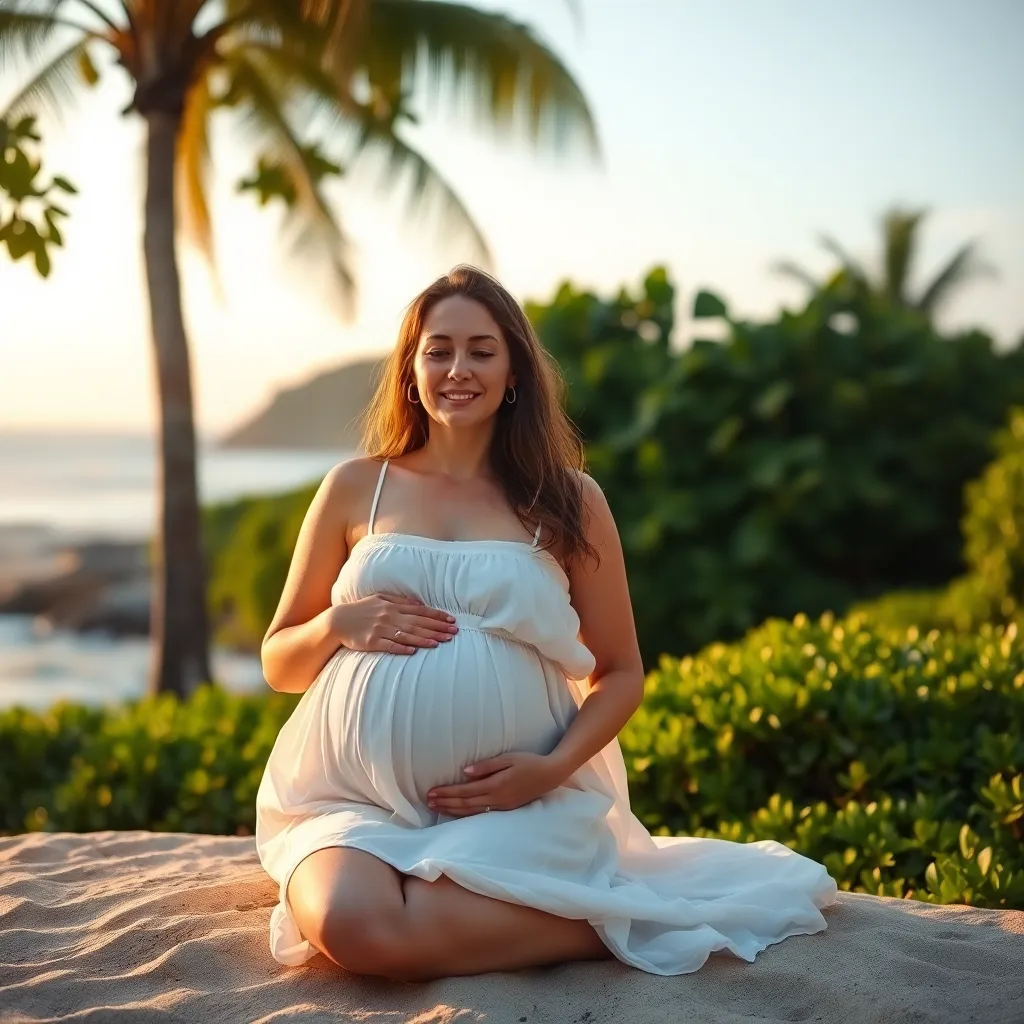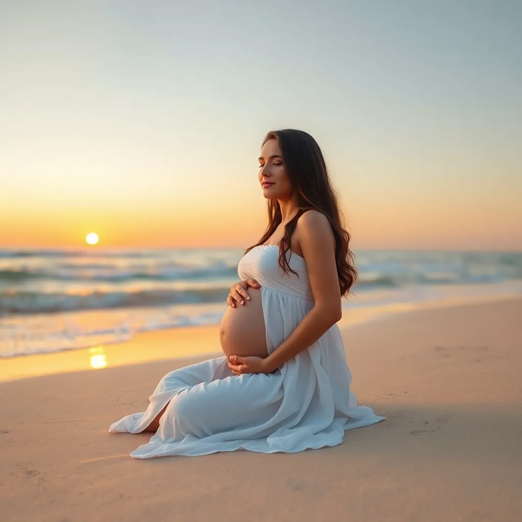 Create an AI-generated image of a serene pregnant woman sitting on a beach at sunset, surrounded by soft waves and a warm glow. She's wearing a flowing white dress and has a peaceful expression, with her belly slightly visible. Incorporate calming colors and textures to evoke a sense of tranquility.