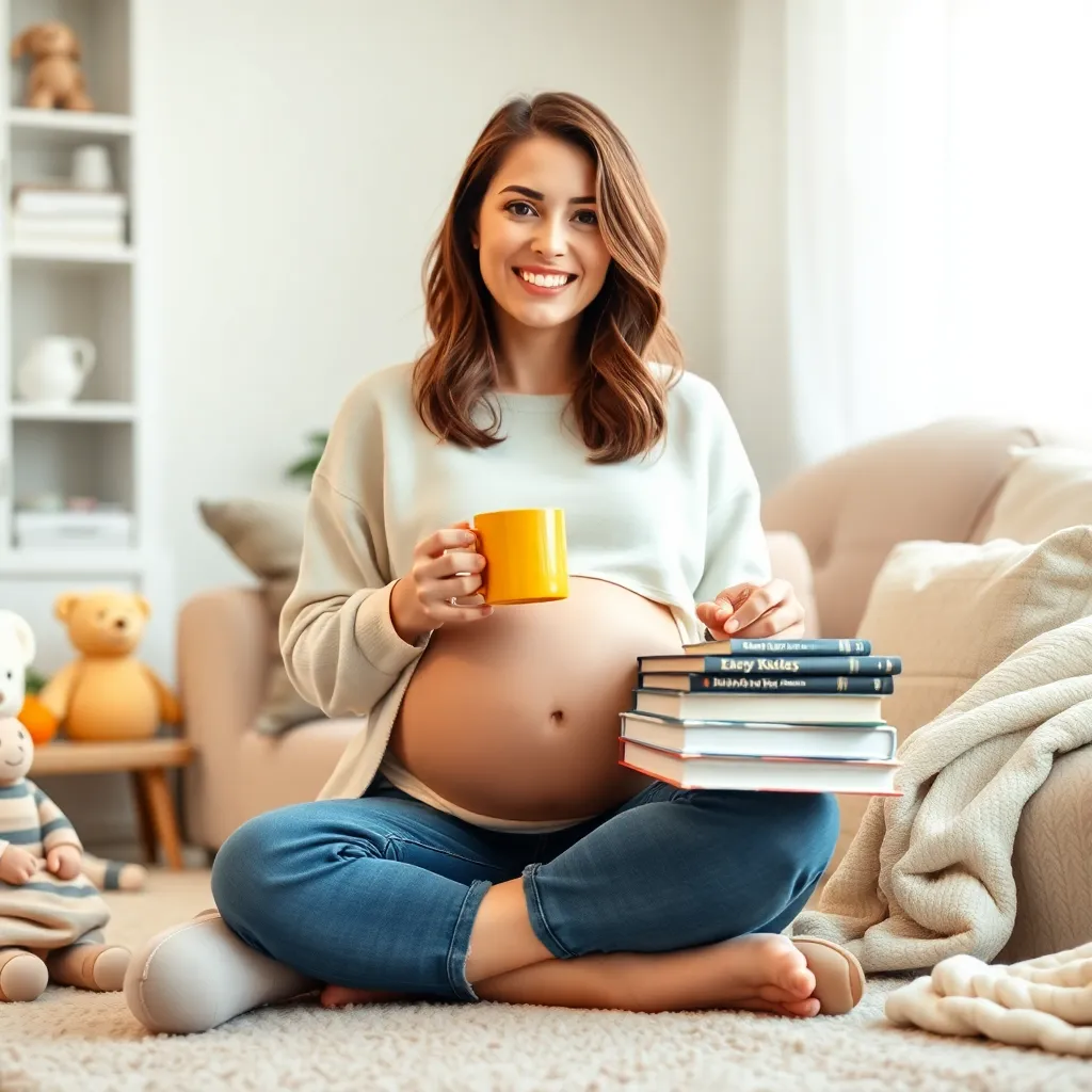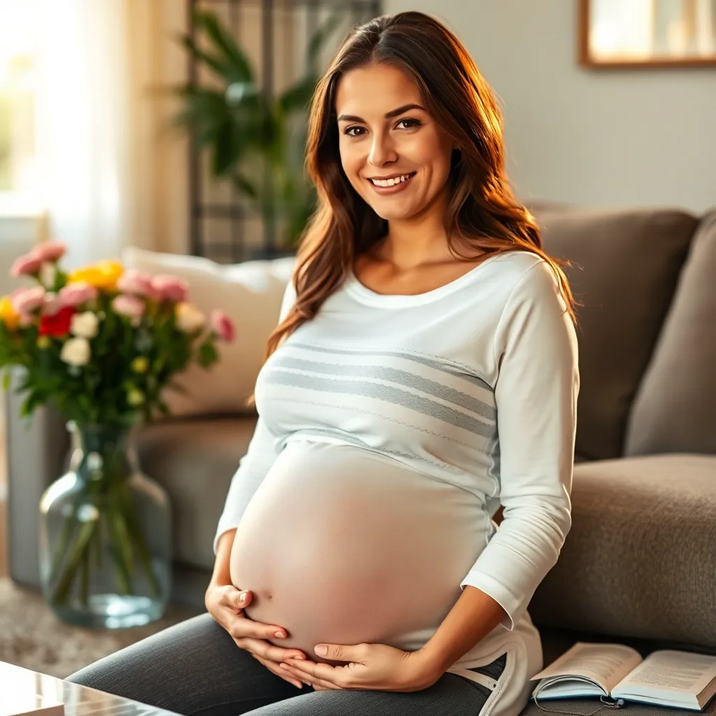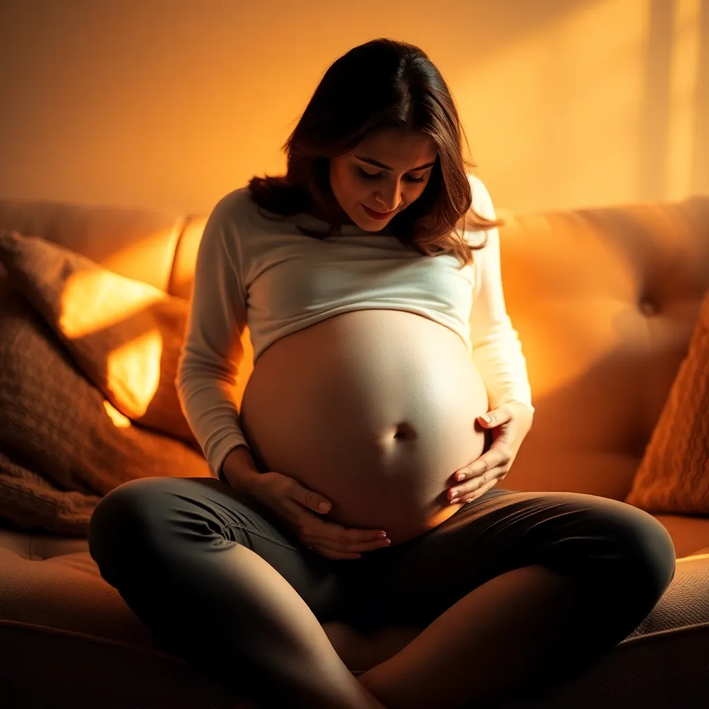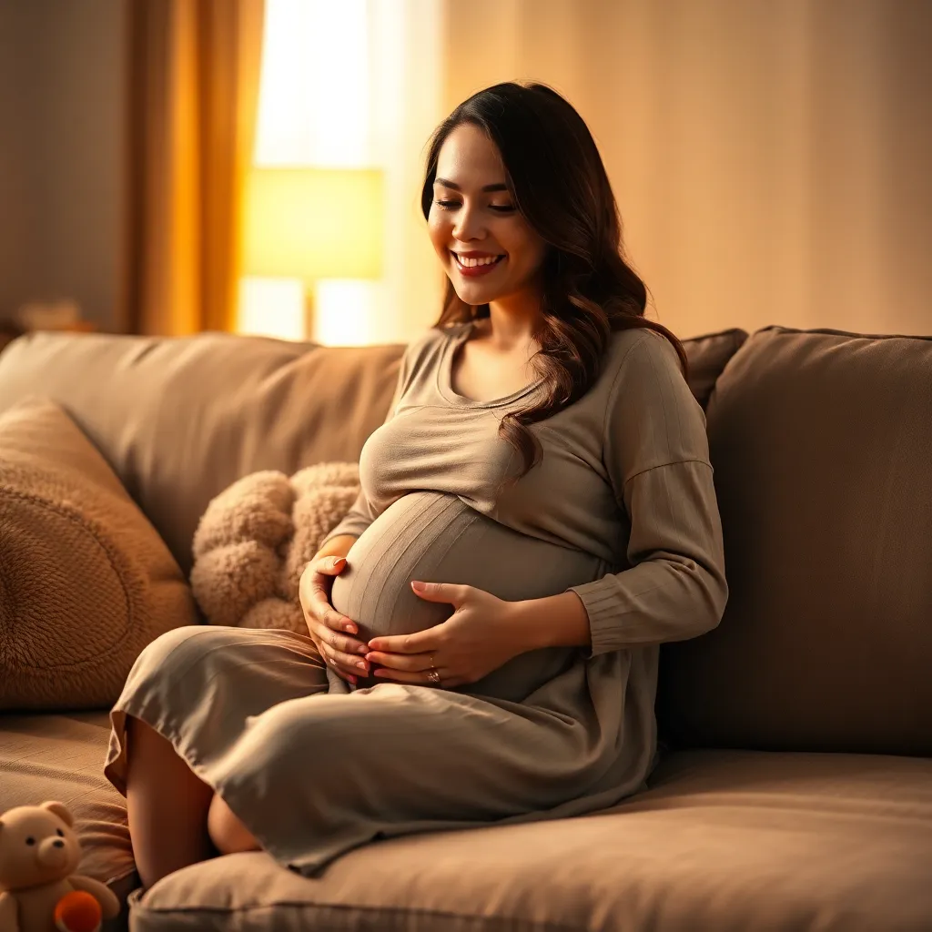 Create an AI-generated image of a happy pregnant woman with a warm, golden glow surrounding her. She's sitting on a plush couch, wearing a comfortable maternity dress, and cradling her growing belly. The atmosphere is cozy, with soft lighting and a few scattered toys nearby. The woman's face is radiant with joy.