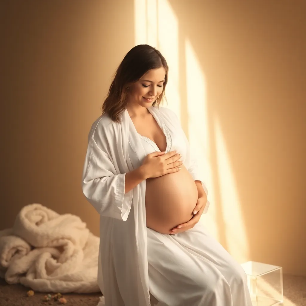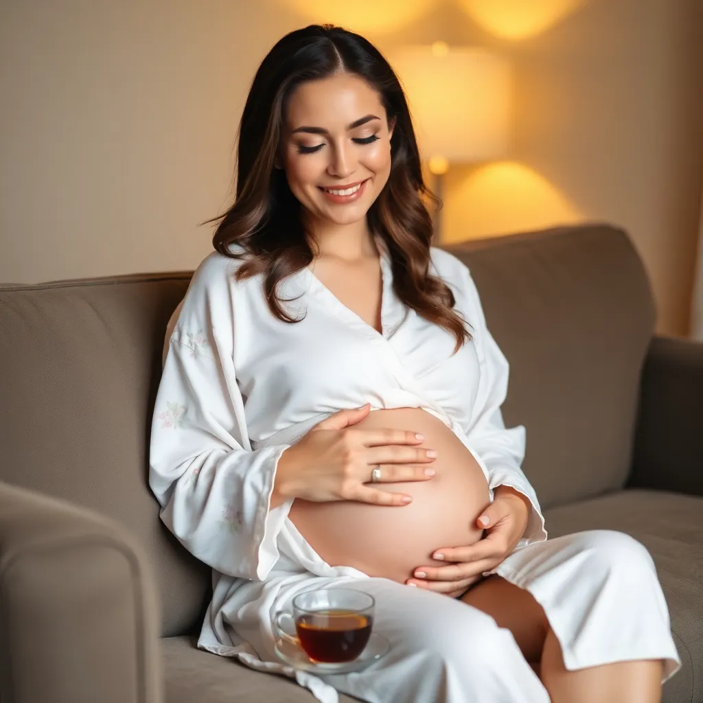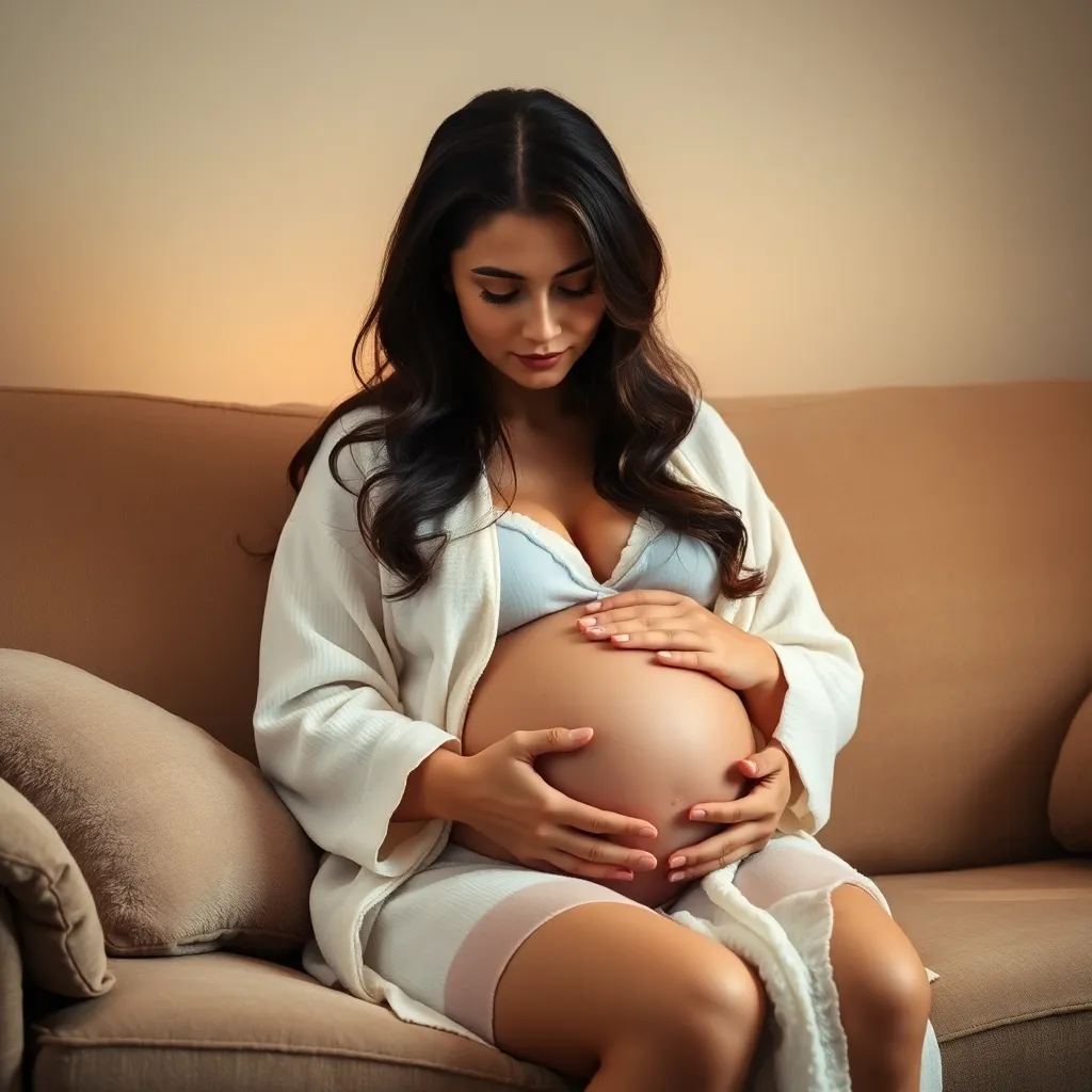 Create a serene and intimate scene of a pregnant woman in her 3rd trimester, sitting on a plush couch with a warm glow. She's wearing a comfortable white robe and has her hands gently cradling her belly. The background is a soft, muted color with subtle texture, evoking a sense of calm and anticipation.