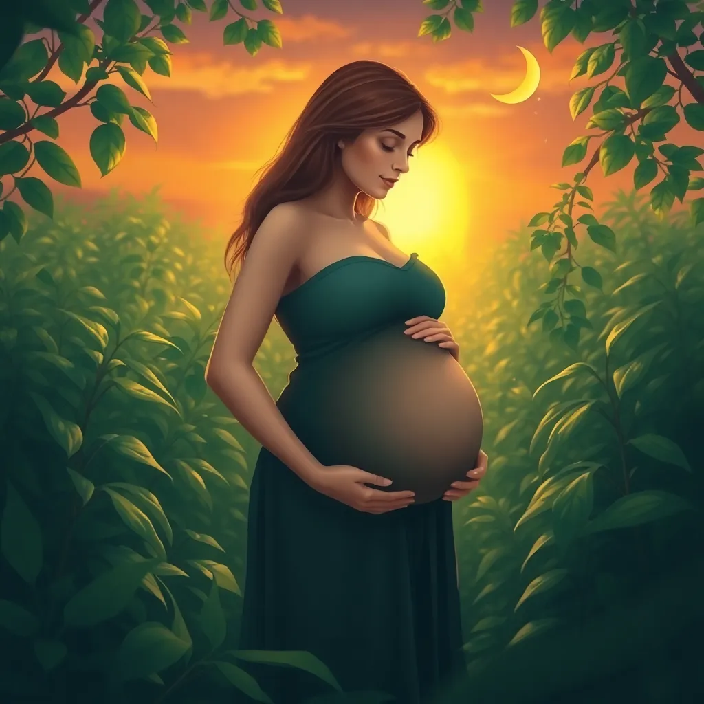 Create a serene and whimsical scene of a pregnant woman surrounded by lush greenery, with a warm glow emanating from the setting sun in the background. Incorporate a few subtle, shimmering stars and a crescent moon to convey a sense of magic and wonder. Use soft, calming colors to evoke a sense of peace.