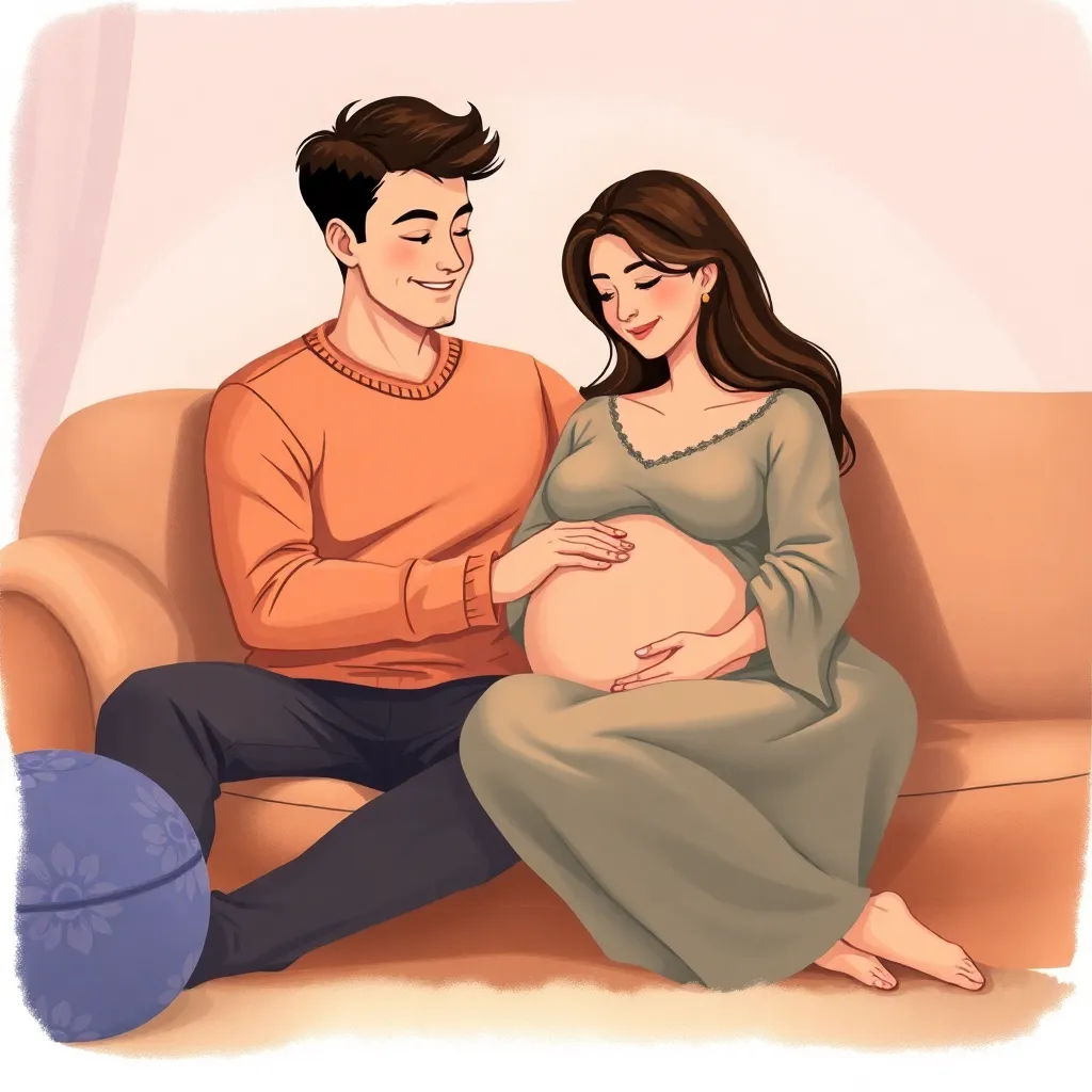 Create an illustration of a loving couple, expecting their first child, in a cozy and intimate setting. The mother-to-be is sitting on a plush couch, cradling her growing belly, while the father-to-be gently strokes her hand. Surround them with soft, warm lighting and calming colors to convey a sense of serenity and joy.