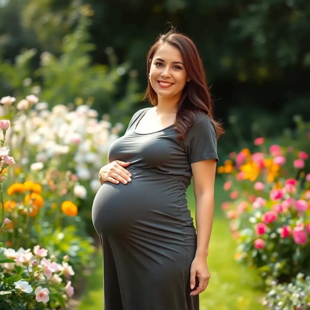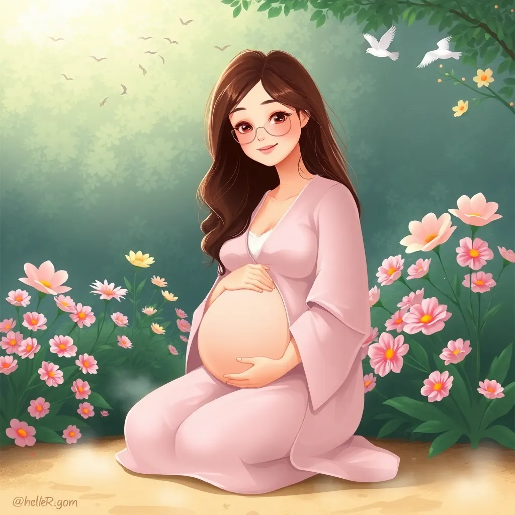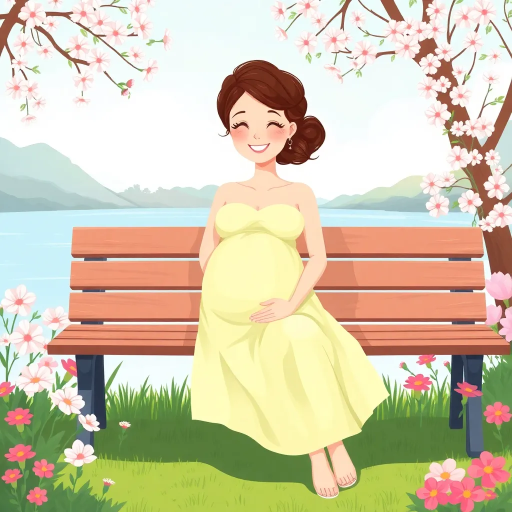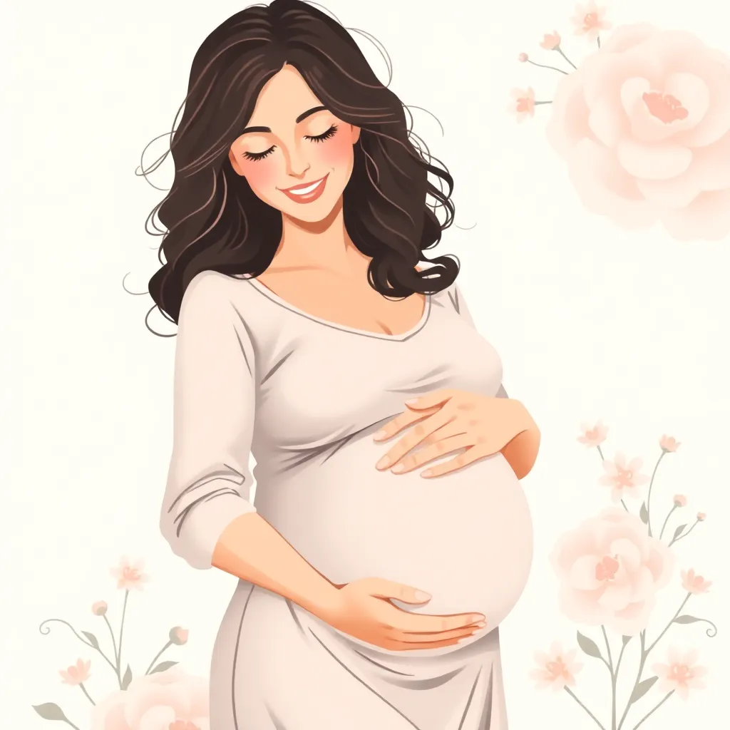 Create an artistic illustration of a serene and stylish pregnant woman, cradling her baby bump with a warm smile. Incorporate soft, pastel colors and delicate florals in the background. Capture the joy and serenity of this special moment, with a subtle sense of anticipation and excitement for the new life.