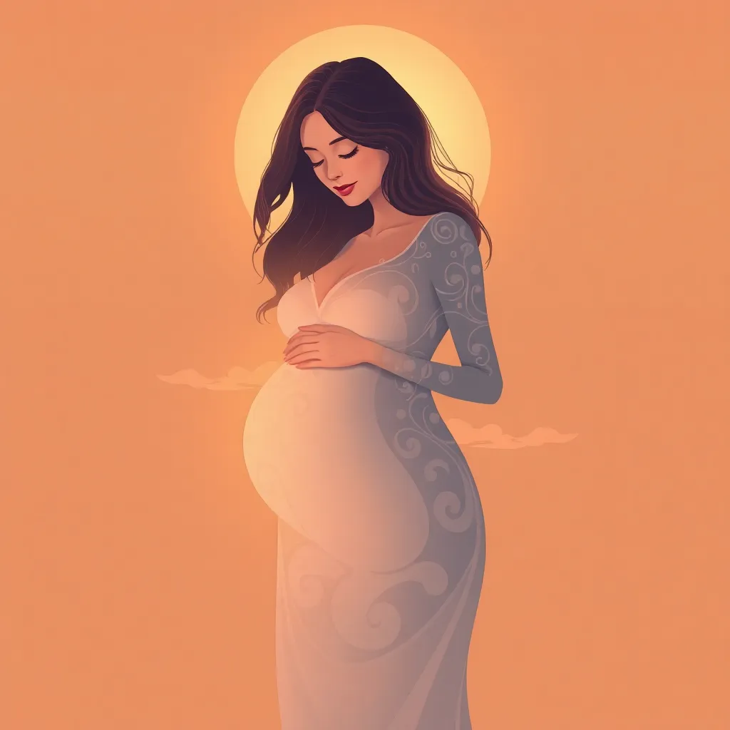 Create an ethereal illustration of a pregnant woman, surrounded by a soft, glowing aura. Her belly is adorned with intricate, swirling patterns that evoke a sense of growth and new life. The background is a warm, sunset-inspired color palette with subtle, wispy clouds. Incorporate gentle, flowing lines and soft textures.