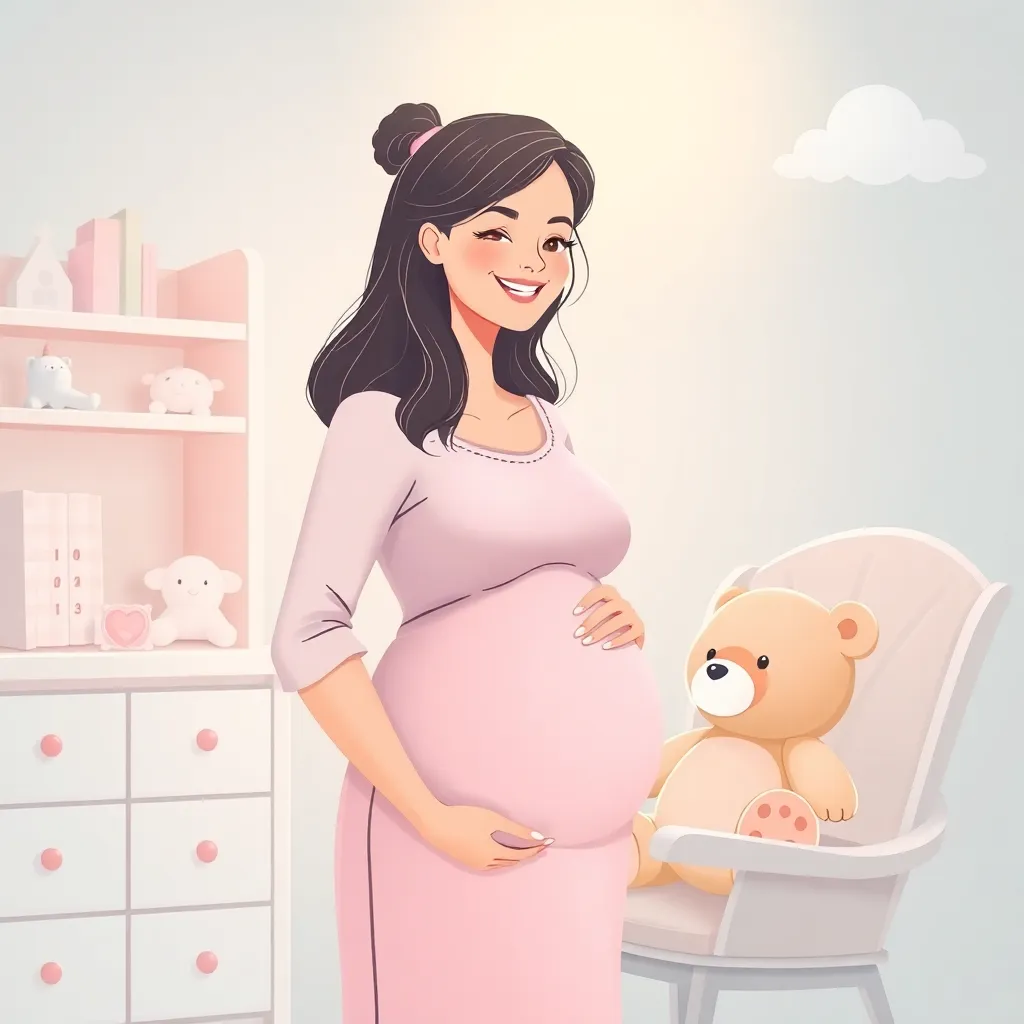 Create an illustration of a happy, expectant mother-to-be, surrounded by a soft, pastel-colored nursery, with a subtle glow and gentle clouds in the background. Incorporate a few toys and books on the shelf, and a soft, plush teddy bear on the rocking chair. The mother's face should radiate joy and serenity.