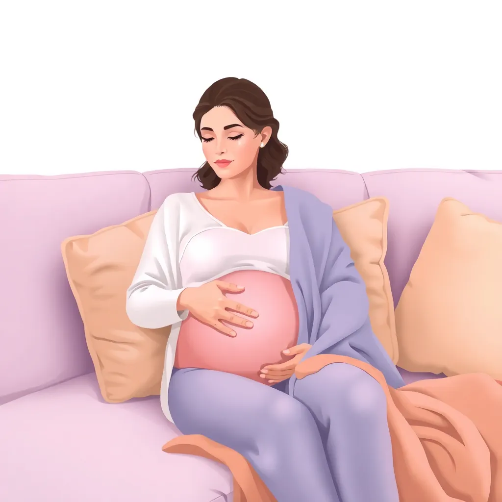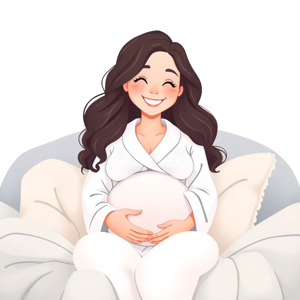 Create an illustration of a happy and relaxed pregnant woman with a warm smile, sitting on a couch surrounded by soft blankets and pillows. She's wearing a comfortable white robe with a subtle sparkle, and her belly is gently rounded. The background is a soothing light blue with fluffy white clouds.