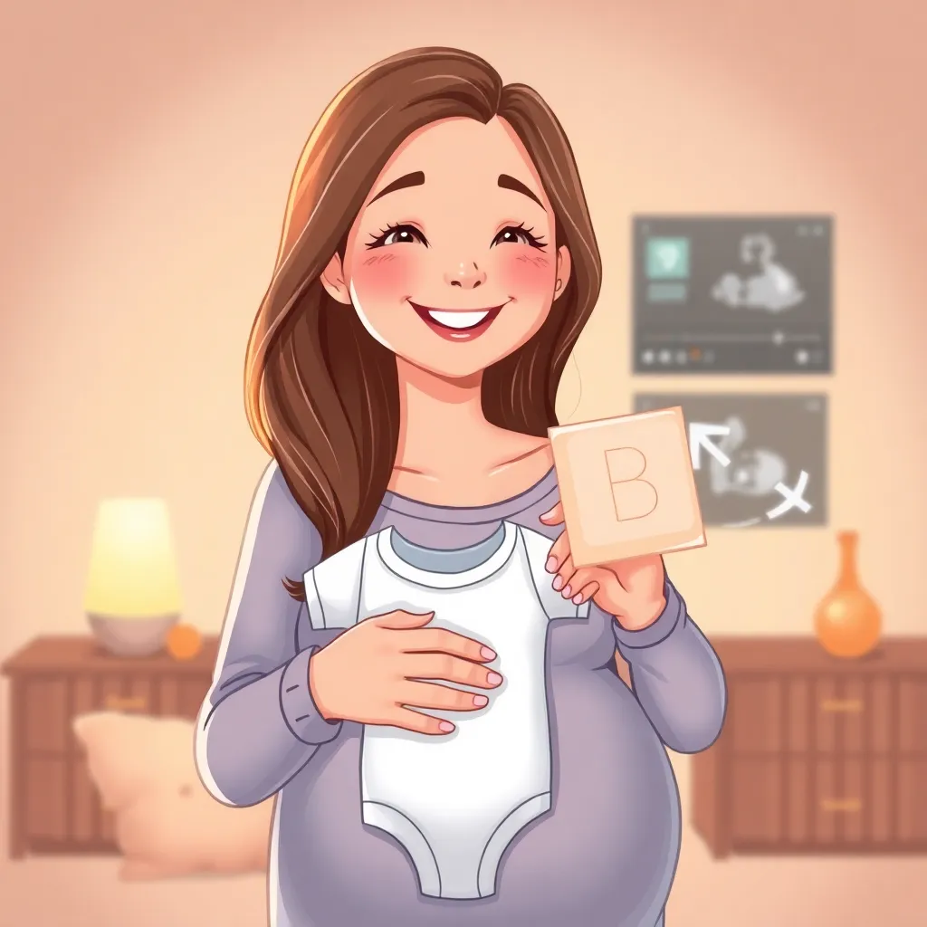 Create an illustration of a happy, expectant mother-to-be, holding a onesie and a baby block, with a subtle ultrasound image in the background. The mom is surrounded by a warm, cozy atmosphere with soft lighting, and the overall mood is serene and joyful, conveying the excitement of an upcoming arrival.
