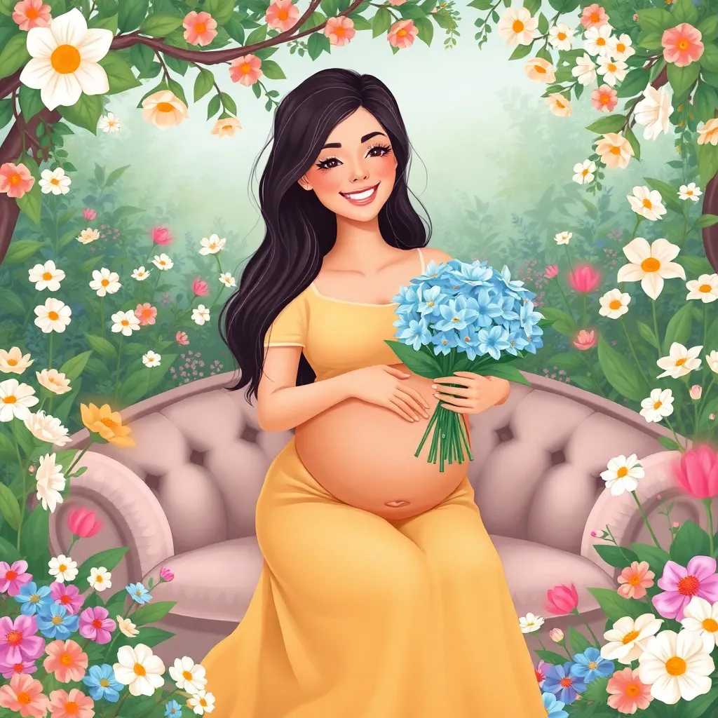 Create an illustration of a happy, expectant mother-to-be, surrounded by a whimsical garden filled with blooming flowers and lush greenery. The mother is sitting on a plush couch, cradling her growing belly with a warm smile, and holding a bouquet of baby blue flowers. The atmosphere is serene and peaceful.