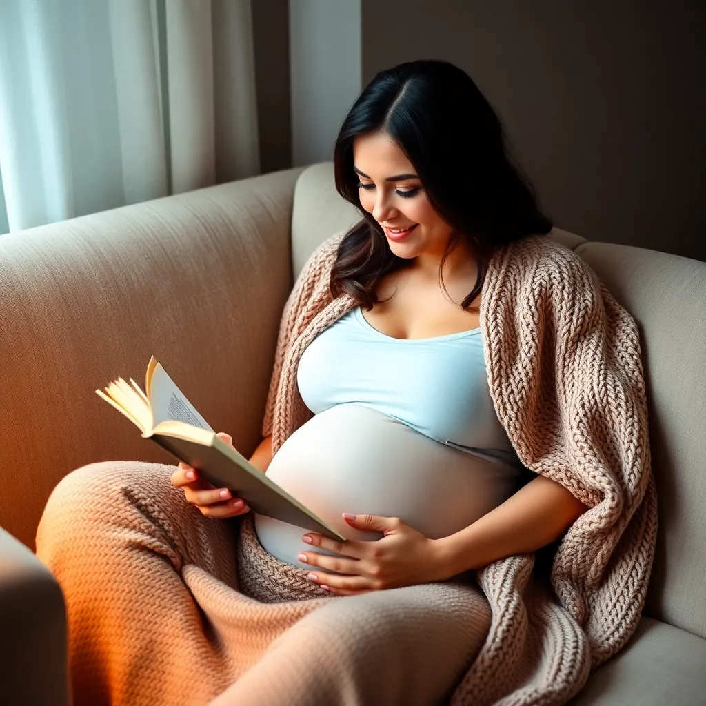 Create a serene and intimate image of a pregnant woman, 28 weeks into her journey, sitting on a plush couch with a warm blanket wrapped around her. She's reading a book with a gentle smile on her face, surrounded by soft lighting and a calming atmosphere, conveying a sense of peace and anticipation.