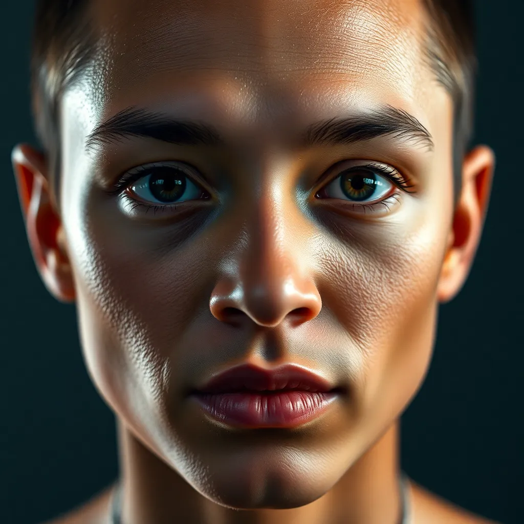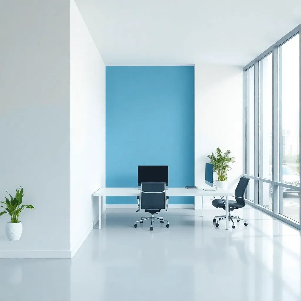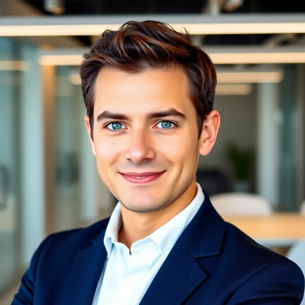 Create a professional headshot for a successful entrepreneur, showcasing confidence and approachability. The subject has short, dark hair and piercing blue eyes. They're dressed in a crisp white shirt and navy blue blazer, with a subtle smile. The background is a modern office space with a minimalist aesthetic.