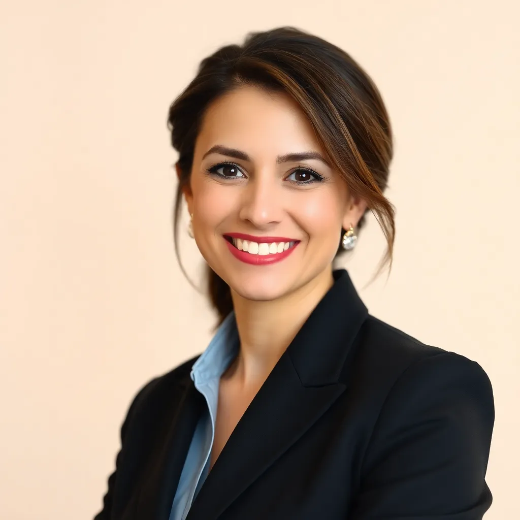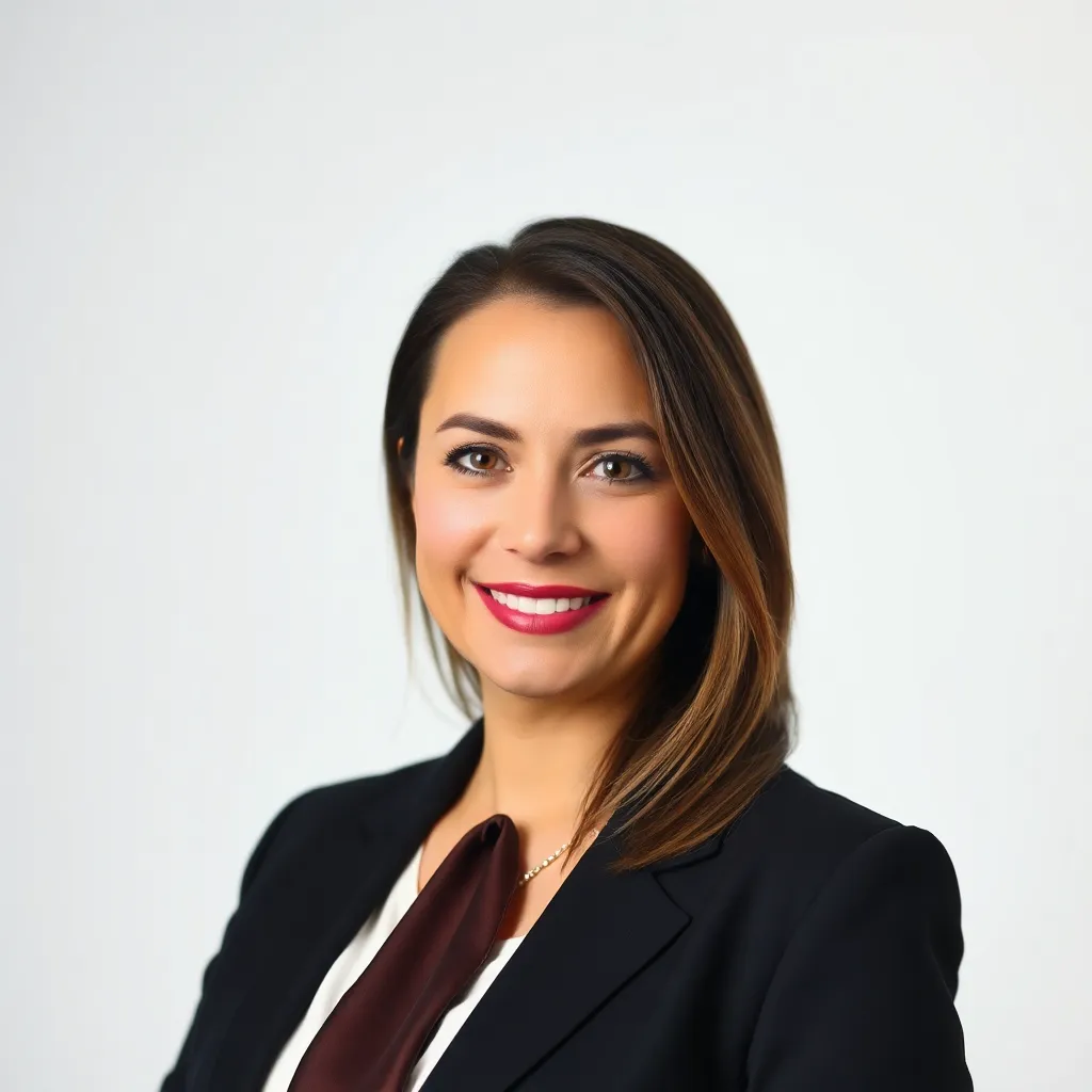 Create a professional headshot of a successful businesswoman, showcasing her confident smile and warm demeanor. Imagine a bright, modern studio with a clean white background, soft natural light, and a subtle hint of sophistication. Capture her in a tailored suit, with a hint of jewelry and a professional hairstyle.