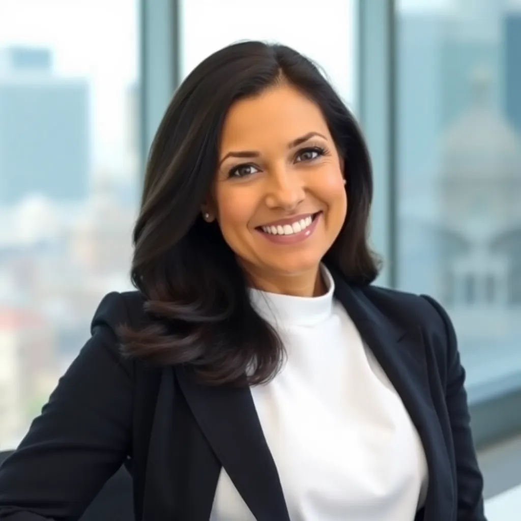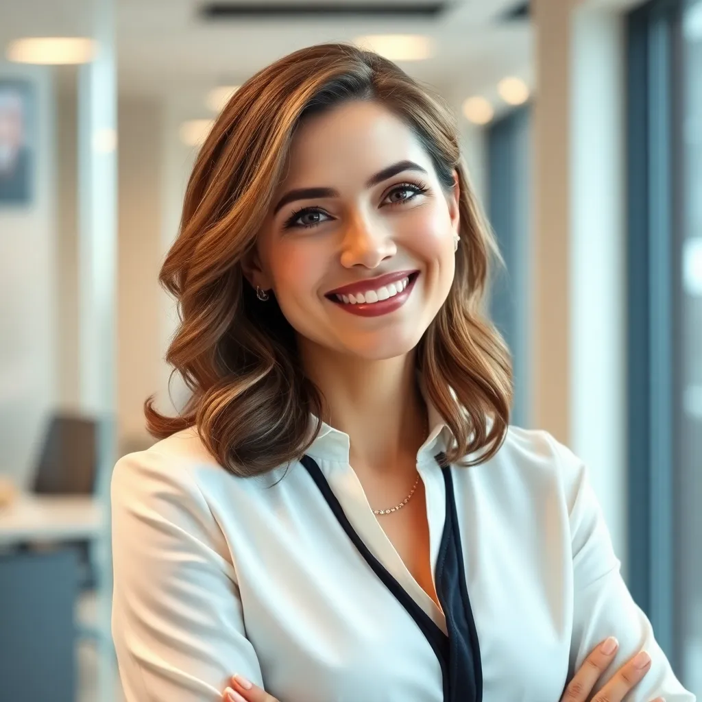 Create a professional headshot for a successful businesswoman, showcasing her confident smile and warm demeanor. Incorporate a subtle background of a modern office or a stylish cityscape. Style her hair in loose waves and dress her in a crisp white blouse and tailored black pants for a polished look.