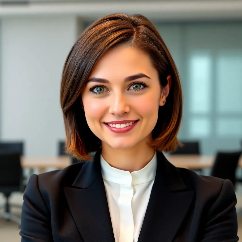 Create a professional headshot for a young entrepreneur, showcasing confidence and approachability. The subject is a 28-year-old woman with short brown hair and bright green eyes. She's wearing a crisp white blouse and a tailored black blazer. The background is a modern, minimalist office setting with a subtle gradient.