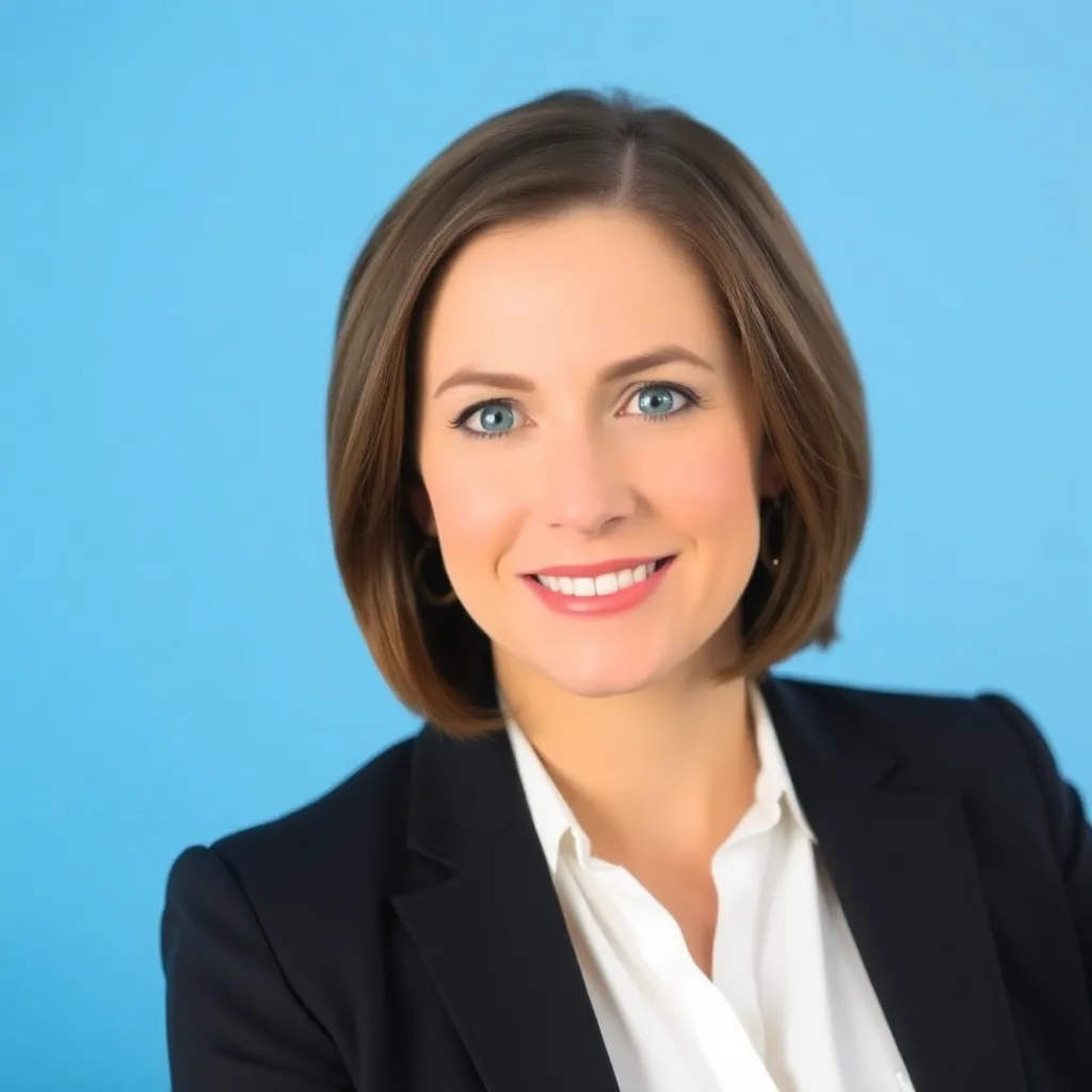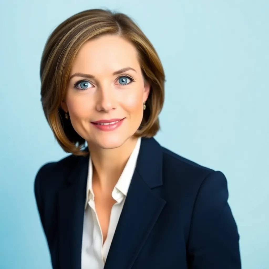 Create a professional headshot for a successful businesswoman. She's a marketing executive in her late 30s, with short brown hair and bright blue eyes. She's dressed in a crisp white blouse and a tailored navy blue suit. The background is a subtle gradient of blue to green, conveying trust and growth.