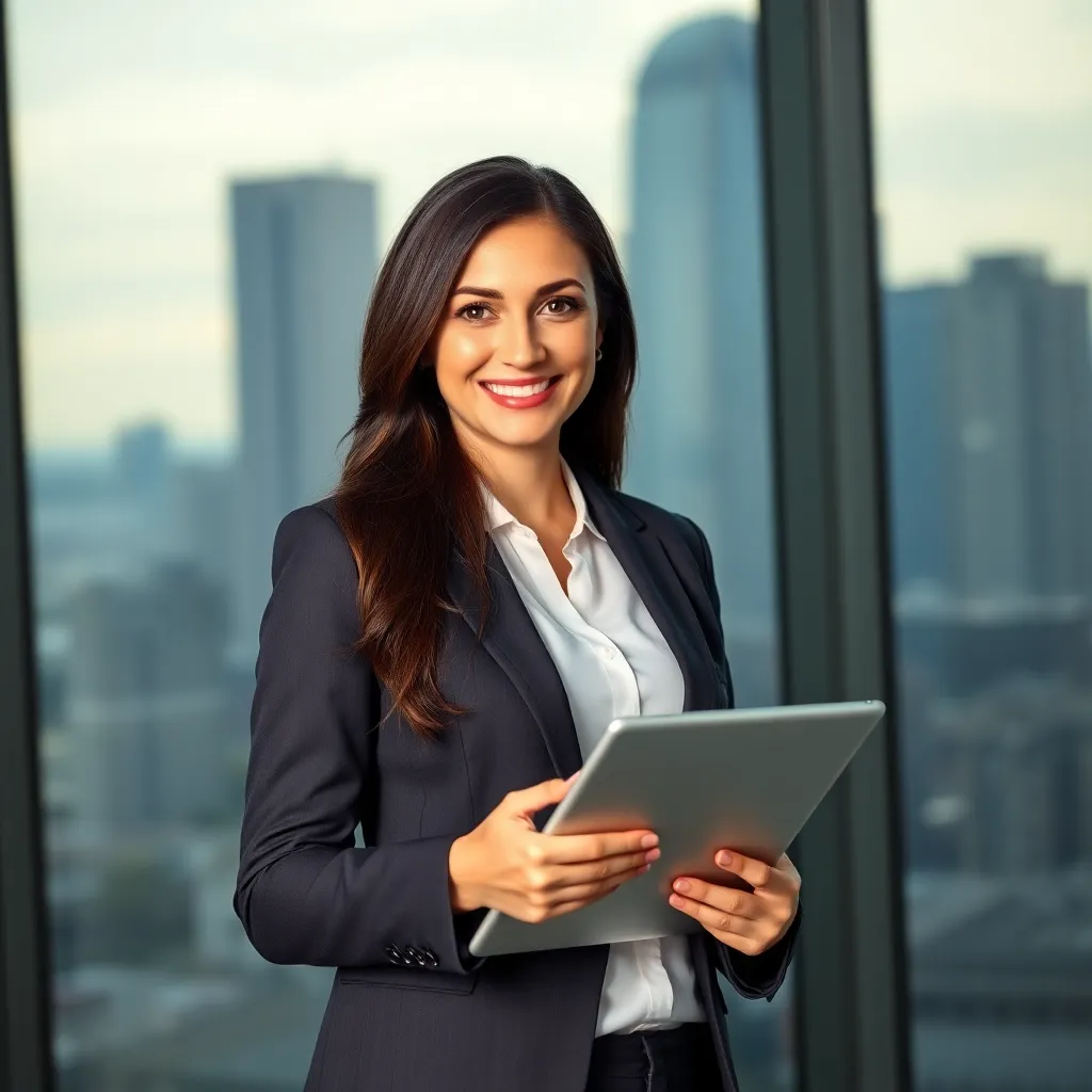 Create a professional headshot for a successful businesswoman, standing in a modern office with a cityscape background. She's wearing a tailored suit, holding a tablet, and smiling confidently. Incorporate a subtle gradient effect and a touch of warmth to convey her approachable yet authoritative personality.