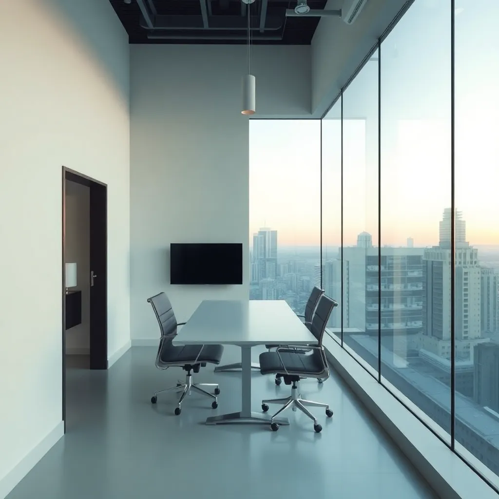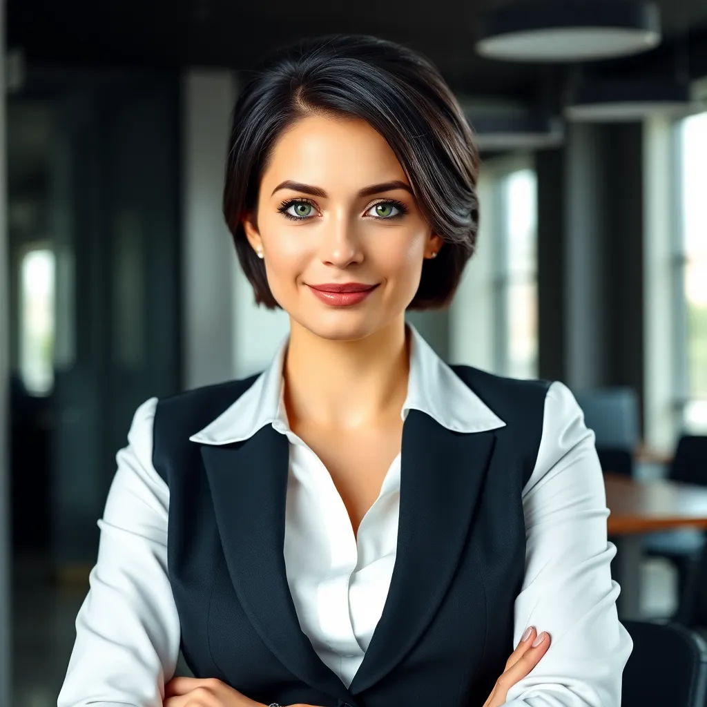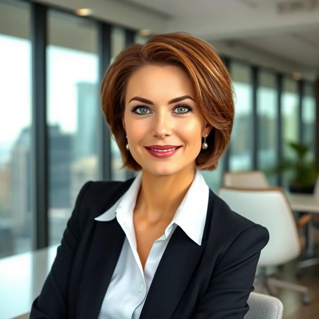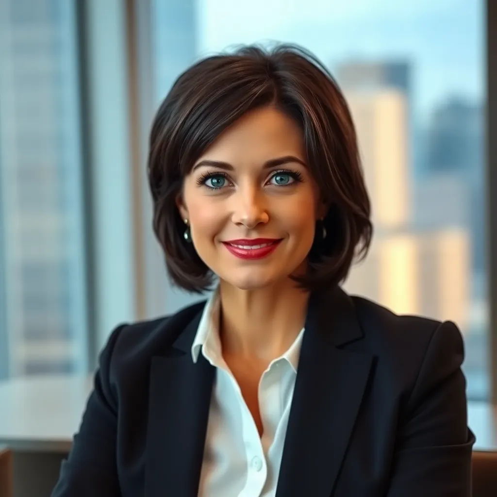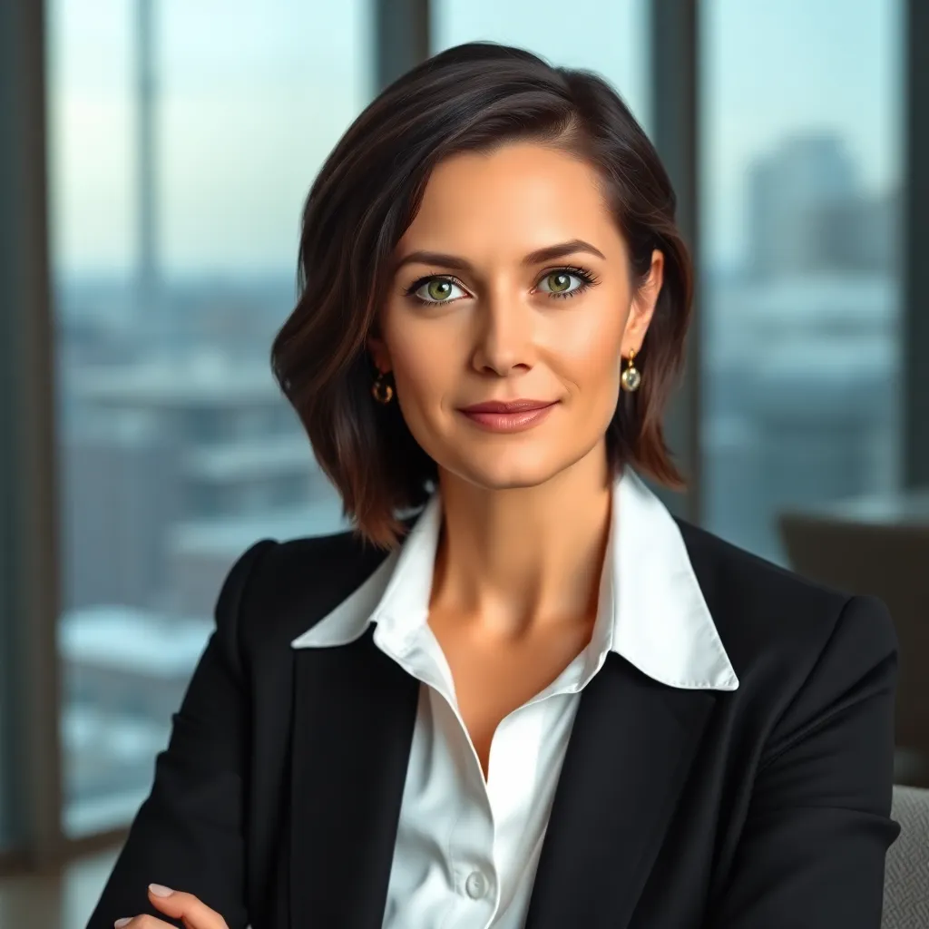Create a professional headshot of a successful businesswoman in her late 30s with short, dark hair and bright blue eyes. She's wearing a crisp white blouse and a tailored black blazer, sitting in a modern office with a subtle cityscape background. Exude confidence, sophistication, and approachability.