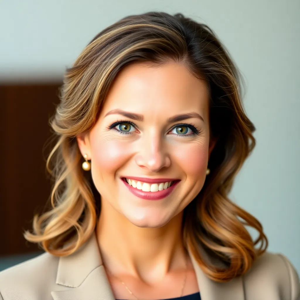 Create a professional headshot for a successful businesswoman, featuring a warm and approachable smile, elegant attire, and a subtle background to draw attention to her face. Hair is styled in loose waves, and accessories are minimal and understated. The image should exude confidence, sophistication, and approachability.