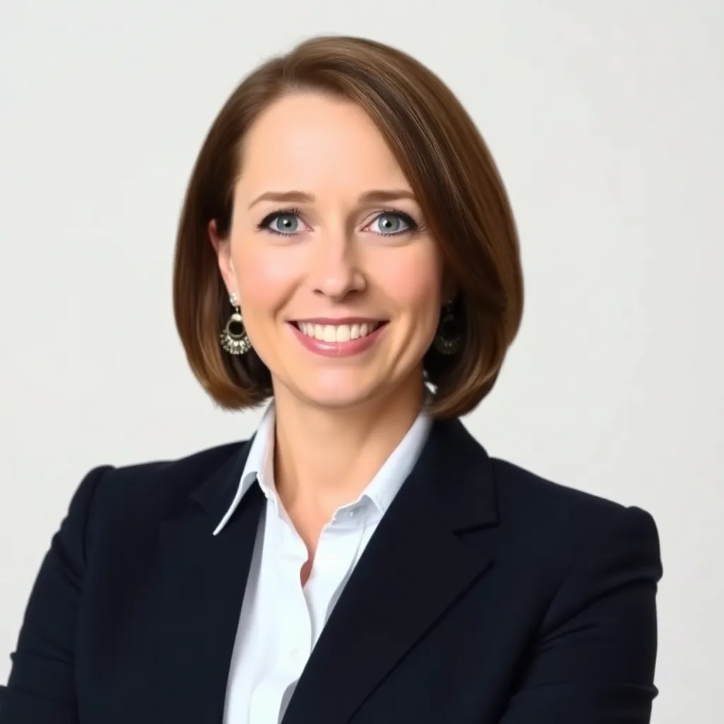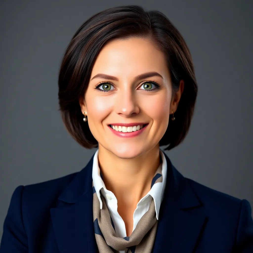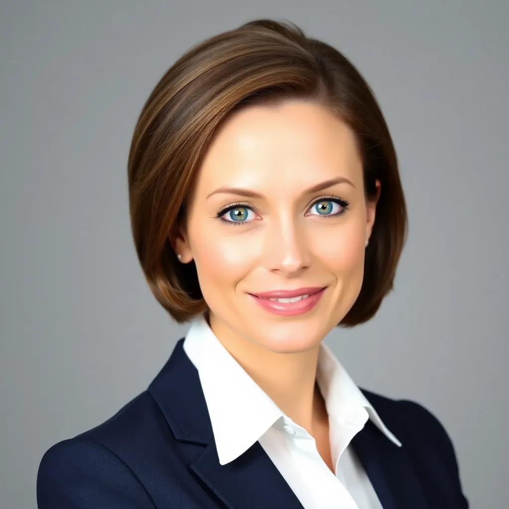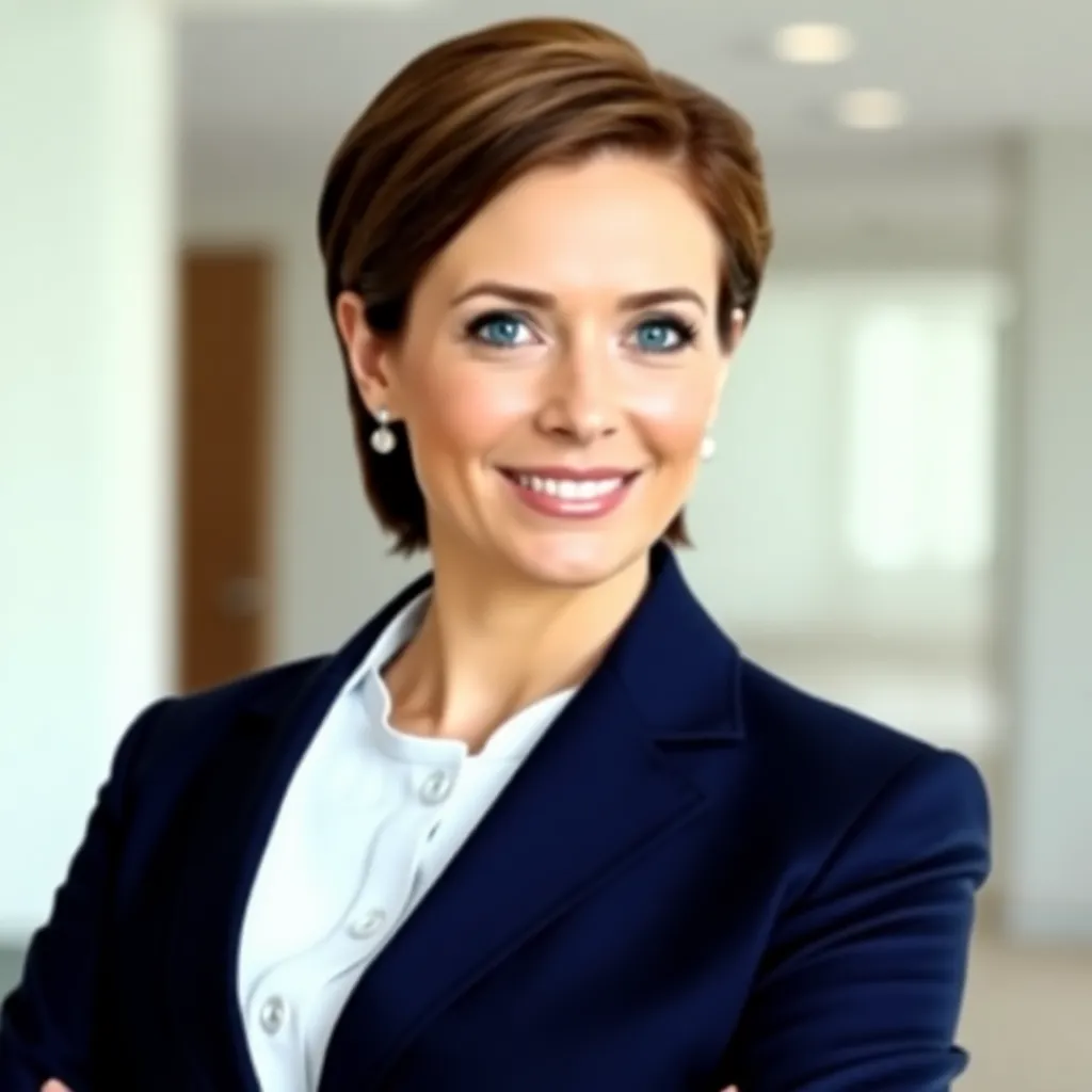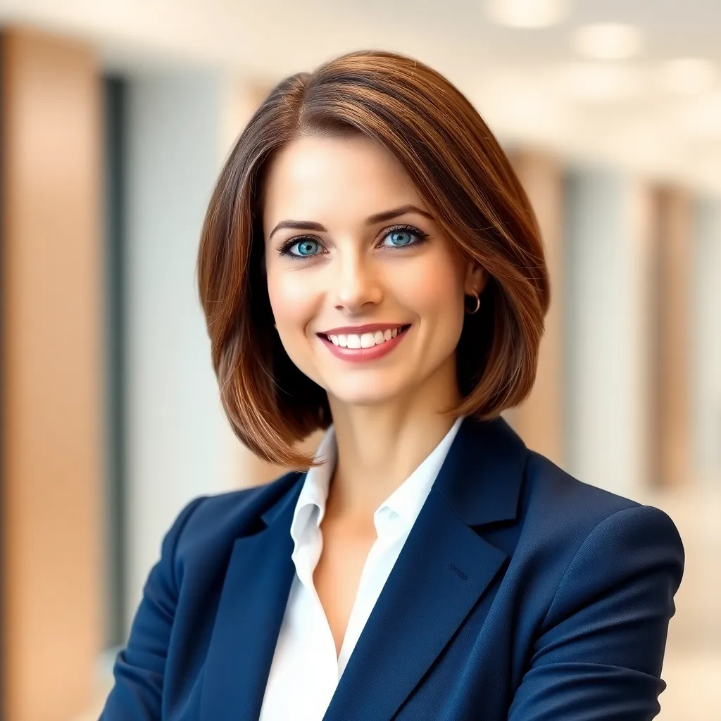 Create a professional headshot of a successful businesswoman, aged 35-45, with short brown hair and bright blue eyes. She's dressed in a crisp white blouse and tailored navy suit, with a confident smile and a slight tilt to her head, conveying authority and approachability in a modern corporate setting.