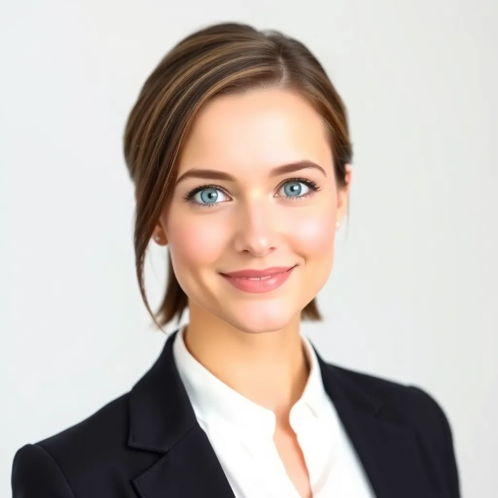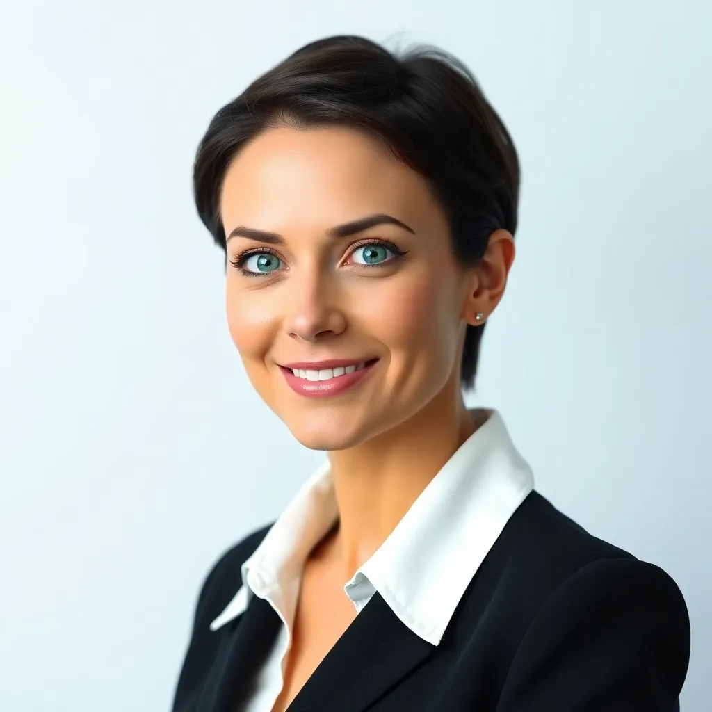Create a professional headshot for a successful businesswoman, 35 years old, with short, dark hair and bright blue eyes. She wears a crisp white blouse and a tailored black blazer. The background is a subtle gradient of blues and whites, conveying trust and sophistication. The expression is confident and approachable.
