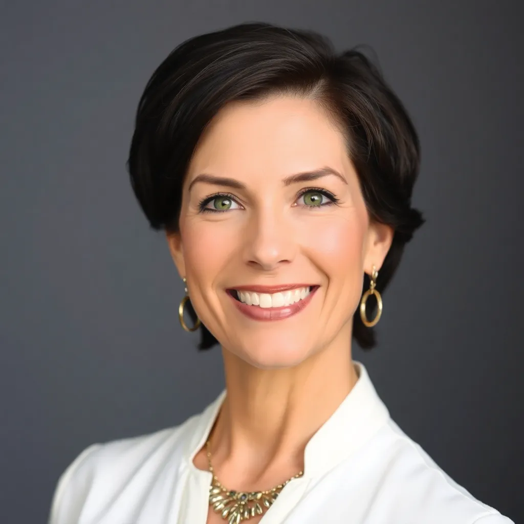 Create a professional headshot for a marketing executive, showcasing a confident and approachable demeanor. Imagine a 45-year-old woman with short, dark hair, piercing green eyes, and a warm smile. She's wearing a crisp white blouse and a statement piece of jewelry. The background is a subtle, gradient gray.