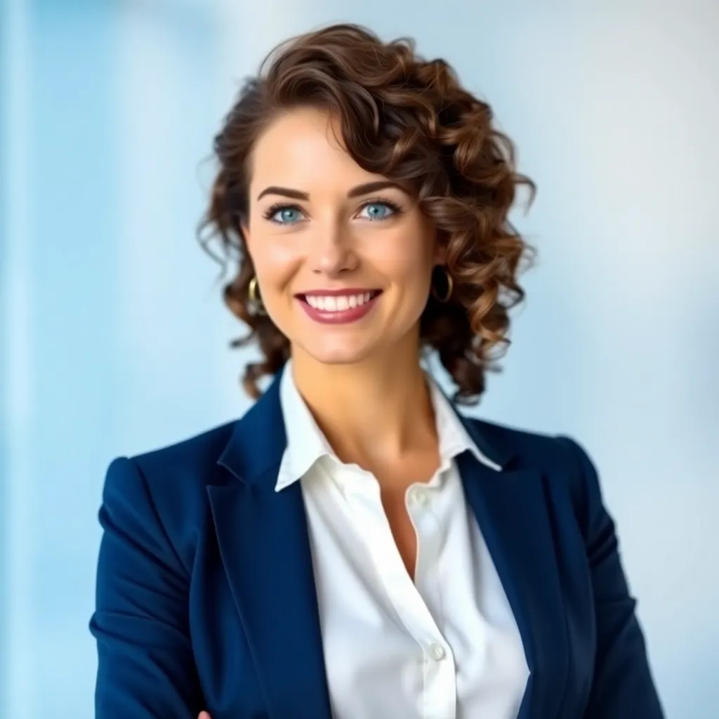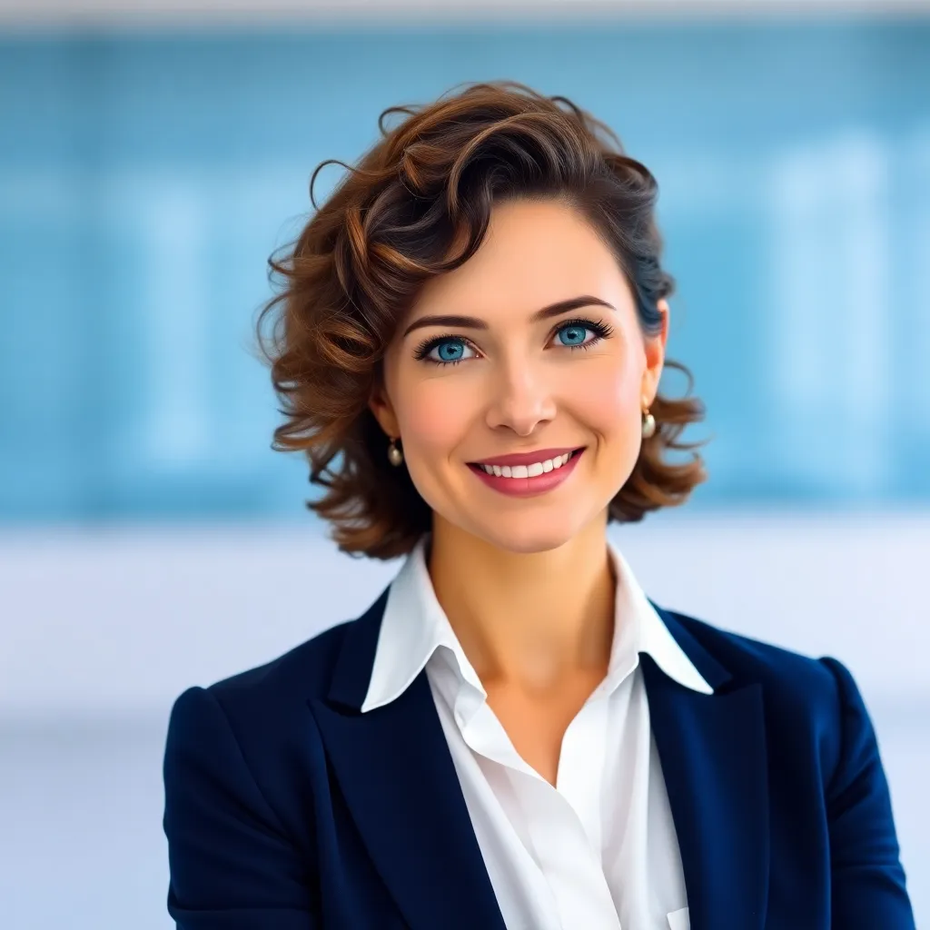 Create a professional headshot for a successful businesswoman, aged 35, with short, curly brown hair and bright green eyes. She's wearing a crisp white blouse and a tailored navy blue blazer. The background is a modern, minimalist office with a subtle gradient of blue and gray. Capture a confident, approachable expression.