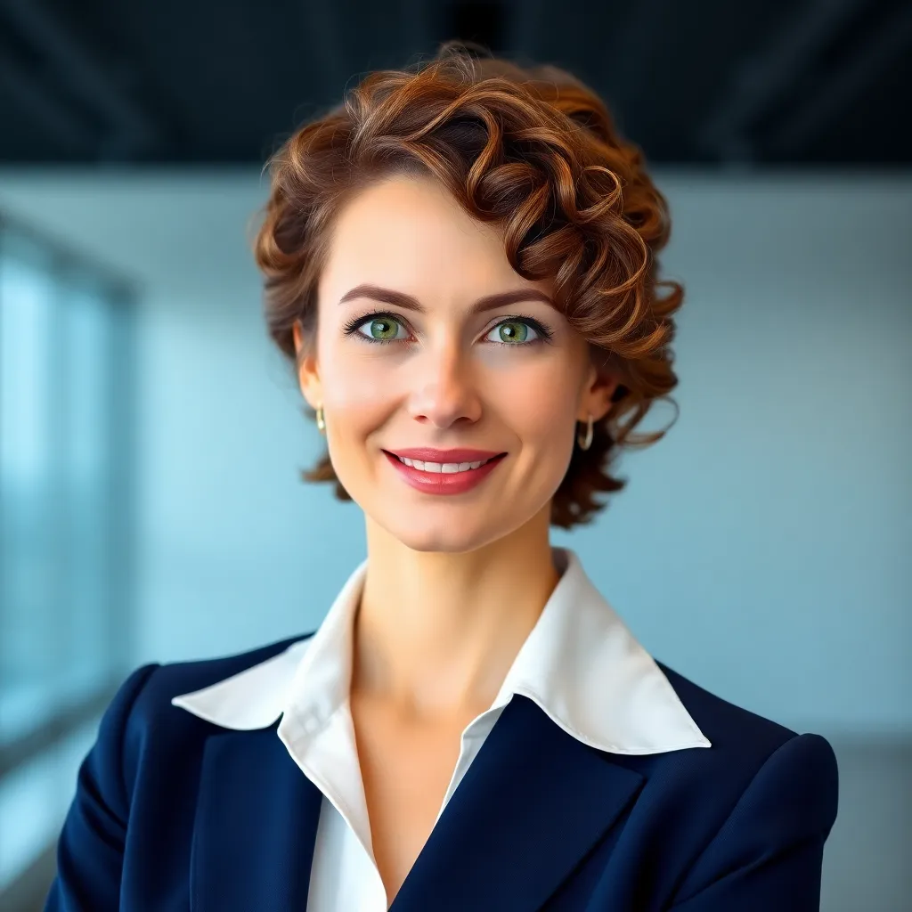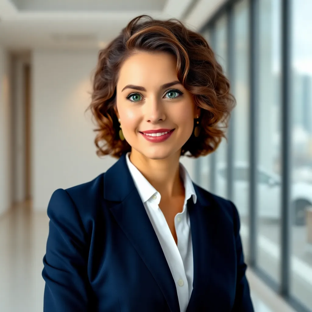 Create a professional headshot for a successful business owner. The subject is a 35-year-old woman with short, curly brown hair and bright green eyes. She's wearing a crisp white blouse and a tailored navy blue blazer. The background is a modern, minimalist office space with a subtle cityscape view.