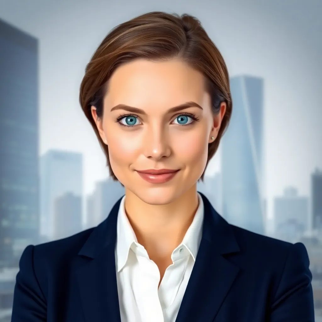 Create a professional headshot of a successful businesswoman, aged 35-45, with short, curly brown hair and piercing green eyes. She's wearing a crisp white blouse and a tailored navy blue blazer, standing in front of a city skyline backdrop with a subtle smile, conveying confidence and approachability.