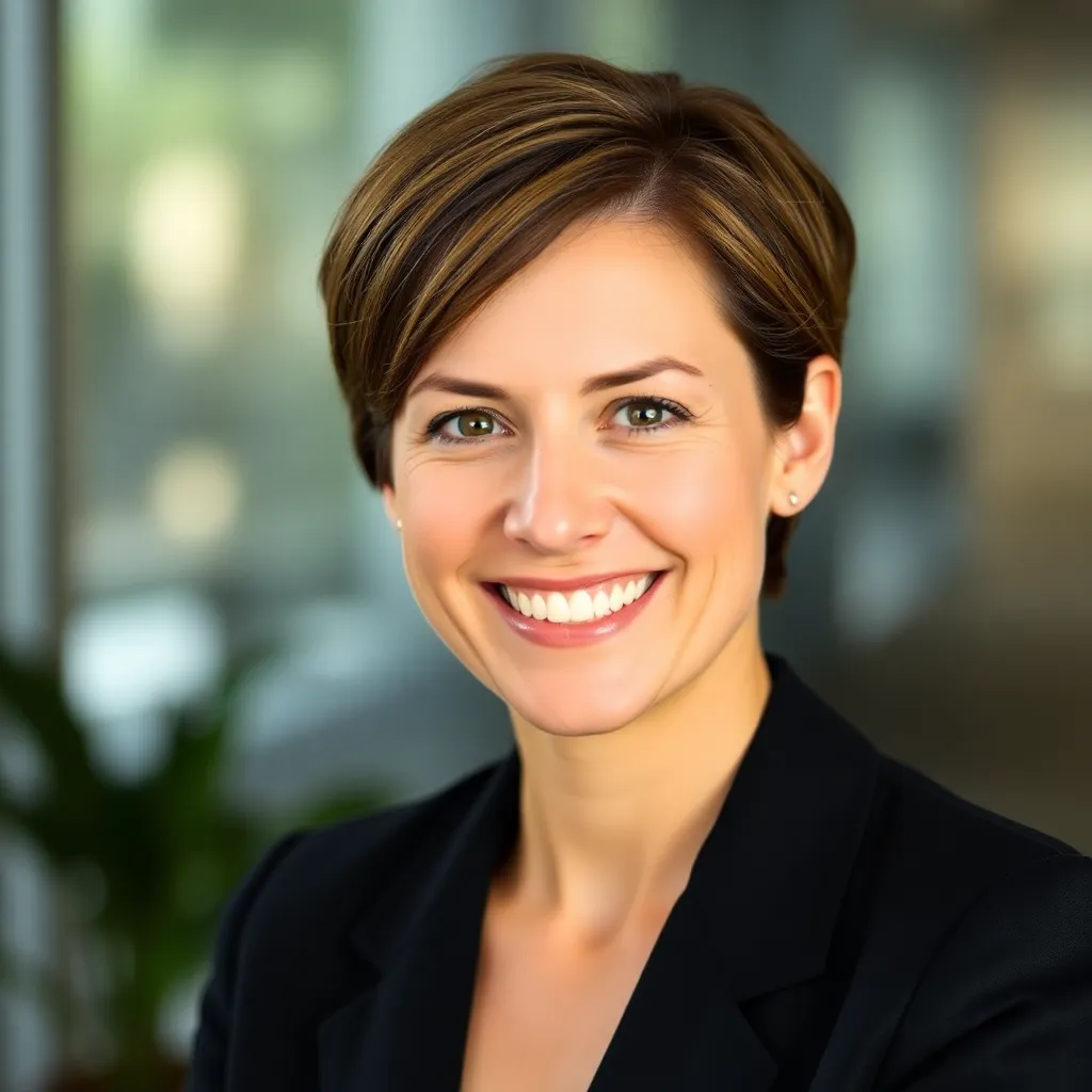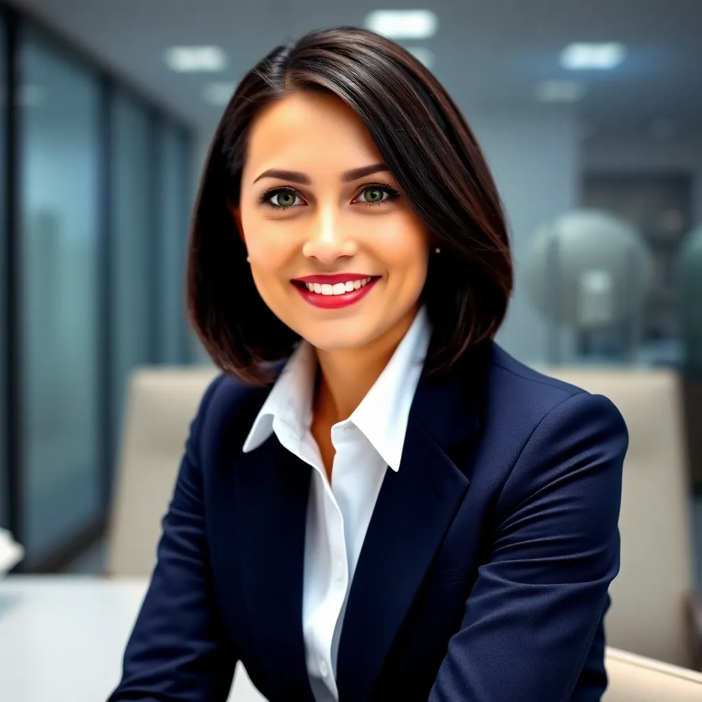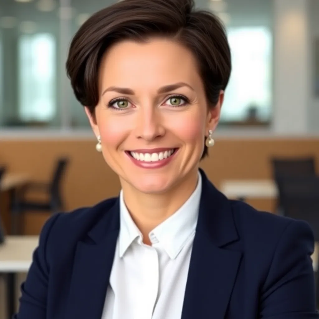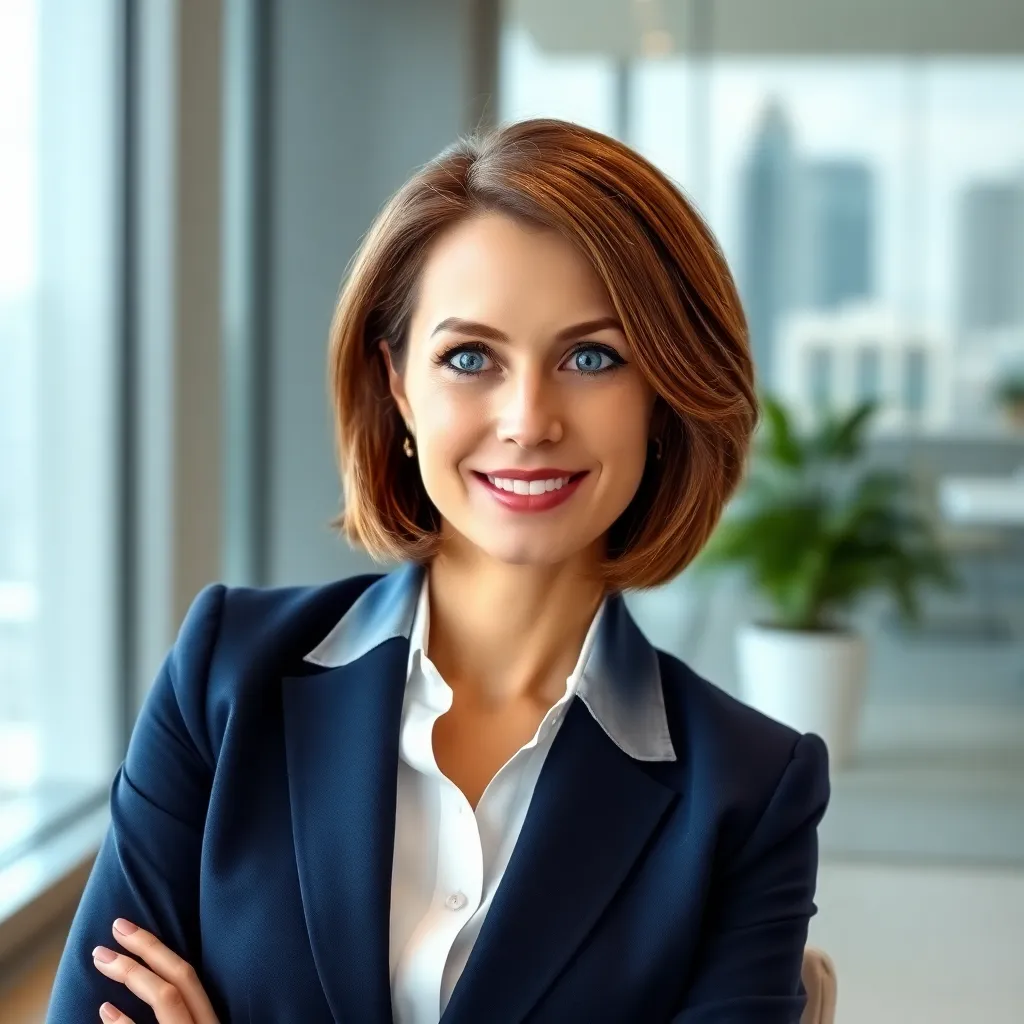 Create a professional headshot for a successful businesswoman in her late 30s, with short brown hair and bright blue eyes. She's wearing a crisp white blouse and a tailored navy blue suit, sitting in a modern office with a subtle cityscape background. Capture her confident and approachable expression.