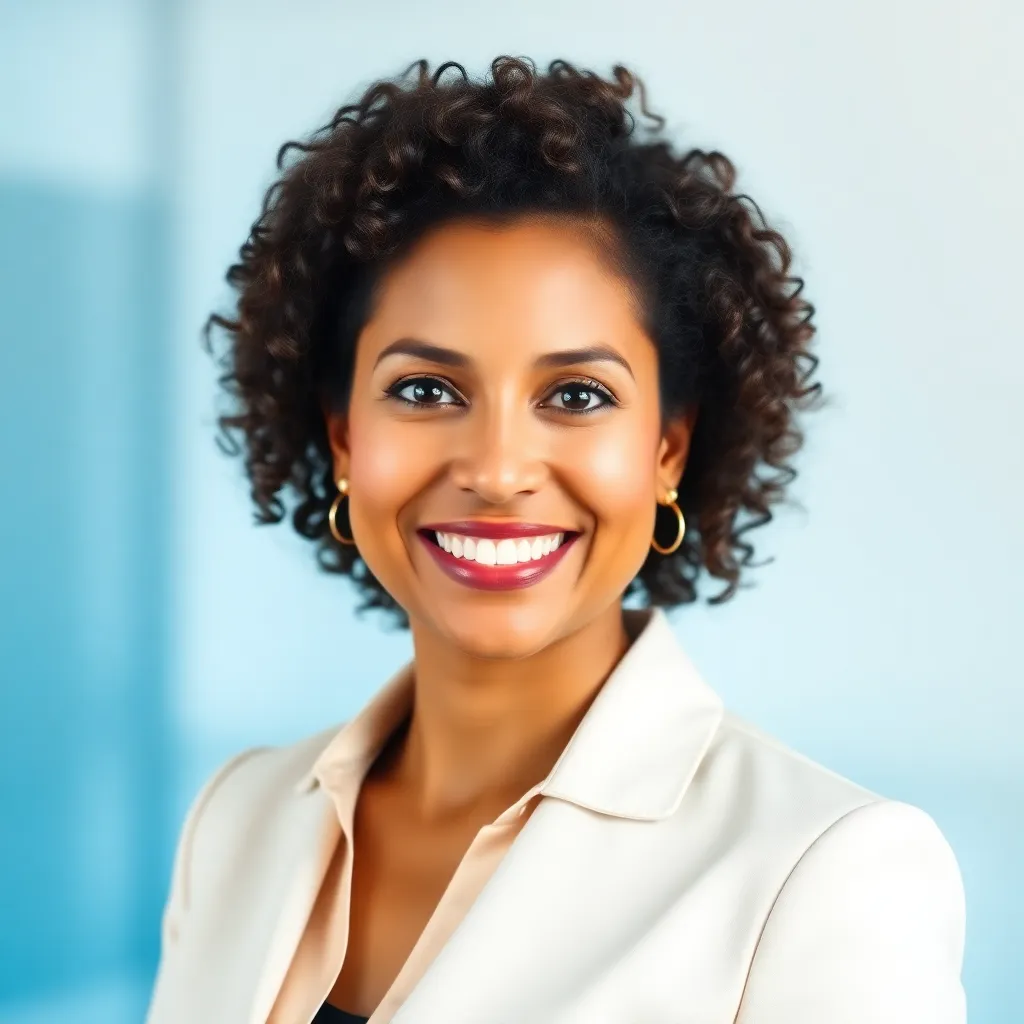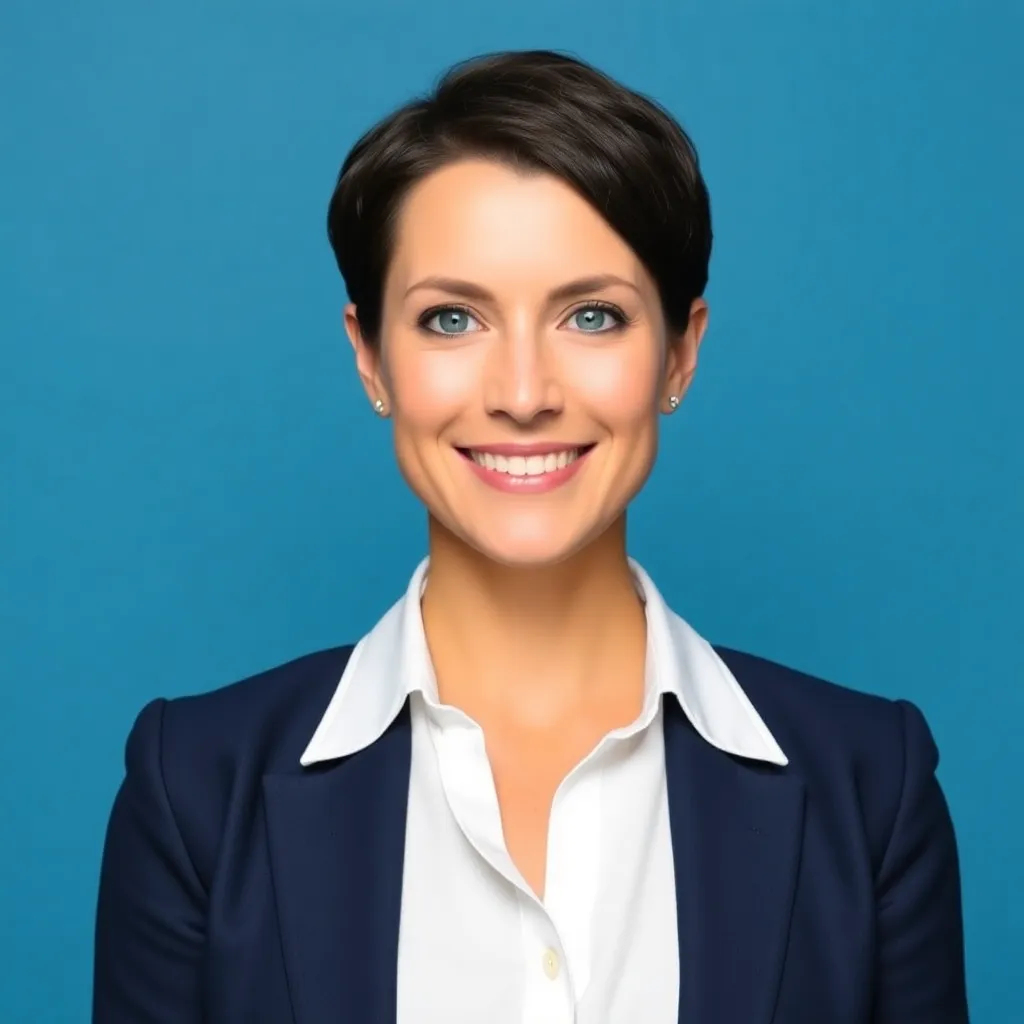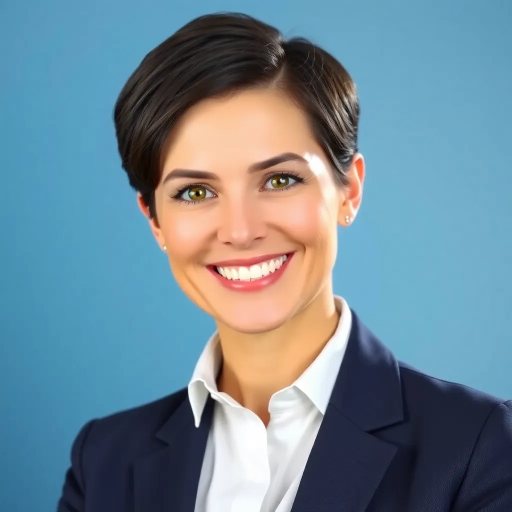 Create a professional headshot of a successful entrepreneur, showcasing confidence and expertise. She has short, dark hair and piercing green eyes. Her bright smile and sharp jawline are accentuated by a crisp white blouse and a tailored blazer. The background is a subtle gradient of calming blues, conveying trust and authority.