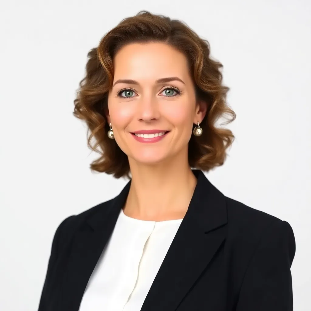 Create a professional headshot for a successful businesswoman, showcasing her confident and approachable personality. Incorporate a crisp white background, subtle lighting, and a slight smile. Style her hair in loose waves and dress her in a tailored suit with a statement piece of jewelry. The final image should exude professionalism and warmth.