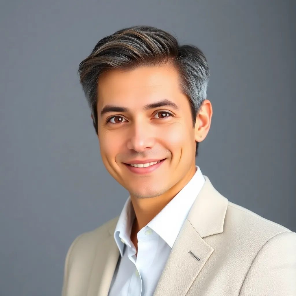 Create a professional headshot that exudes confidence and expertise. Imagine a successful business executive, with a warm and approachable smile, set against a clean and modern background. Incorporate a subtle gradient of blue and white hues to evoke a sense of trust and sophistication. Generate an image that makes a lasting impression.