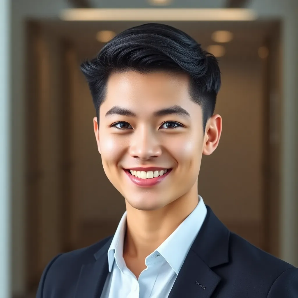 Create a professional headshot for a young business executive, showcasing a confident and approachable smile. Incorporate a modern, minimalist background with subtle lighting to accentuate the subject's features. Hair should be styled neatly, and attire should be formal yet stylish, conveying a sense of authority and professionalism.