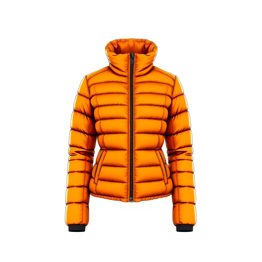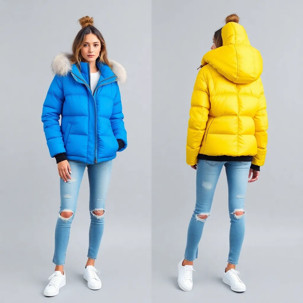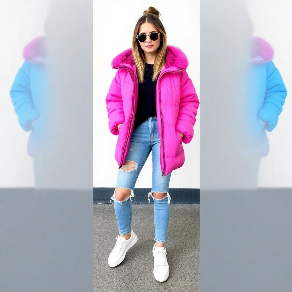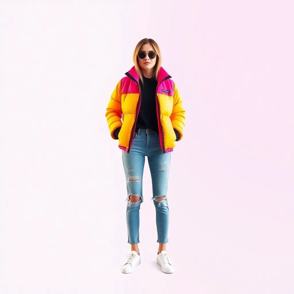 Create an image of a trendy puffer jacket with a bold, bright color scheme. The jacket should have a sleek design with a fitted silhouette, a high collar, and adjustable cuffs. Incorporate subtle texture and shading to give the image depth and dimension. Style the jacket with a pair of distressed denim jeans and white sneakers.