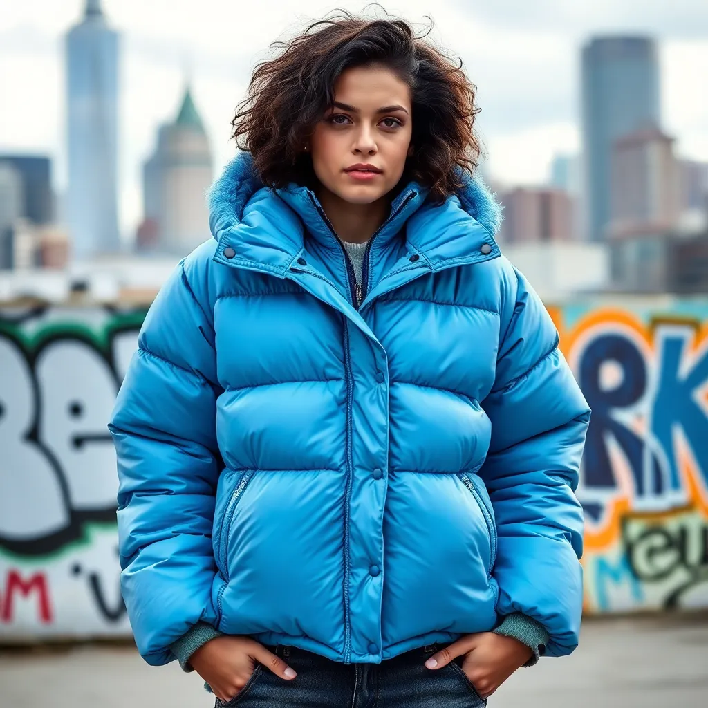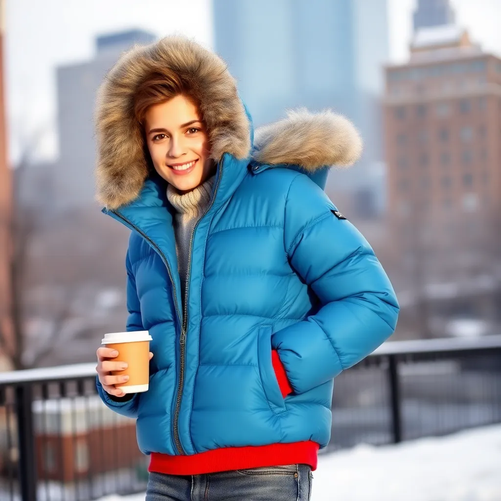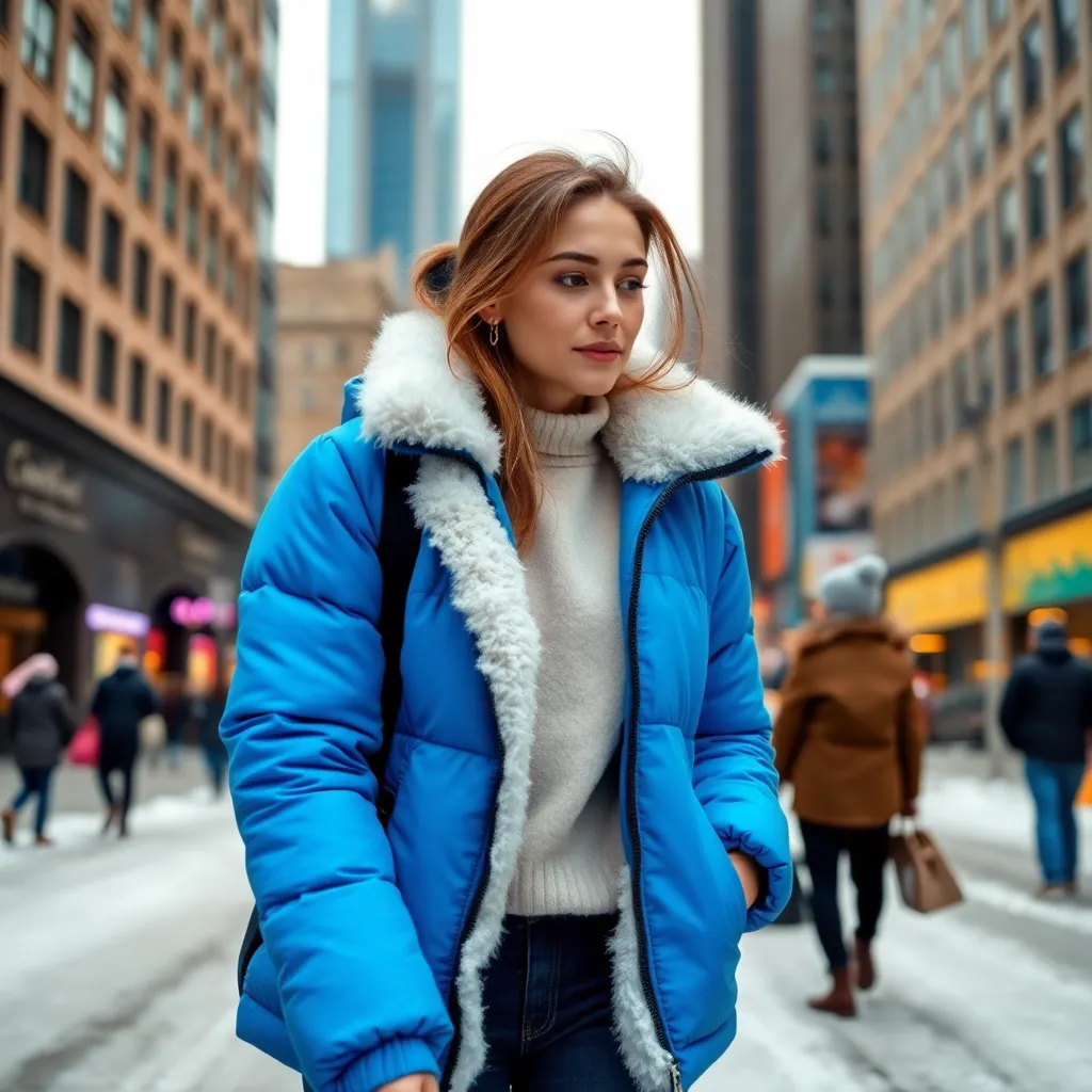 Imagine a trendy puffer jacket worn by a young woman on a crisp winter morning. The jacket is a bold shade of bright blue, with a fluffy white trim and a sleek black zipper. She's walking down a snowy street, surrounded by towering skyscrapers and bustling city life. Create an image that captures her stylish and adventurous vibe.