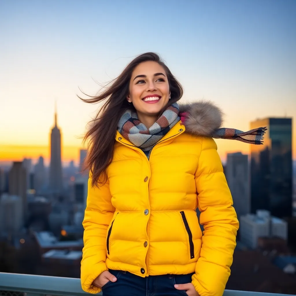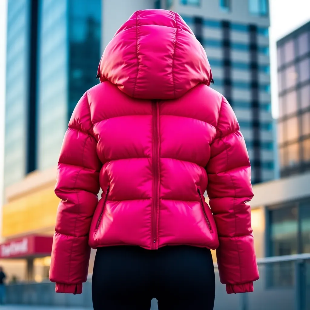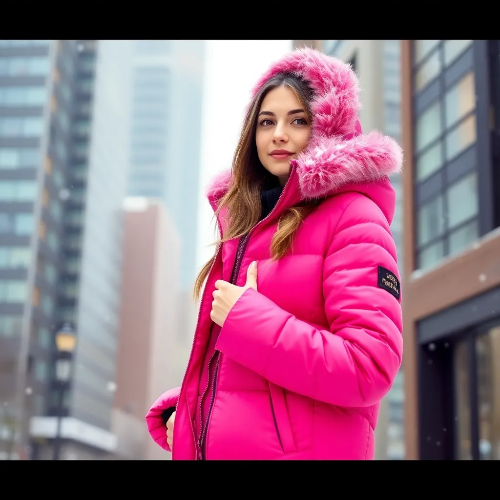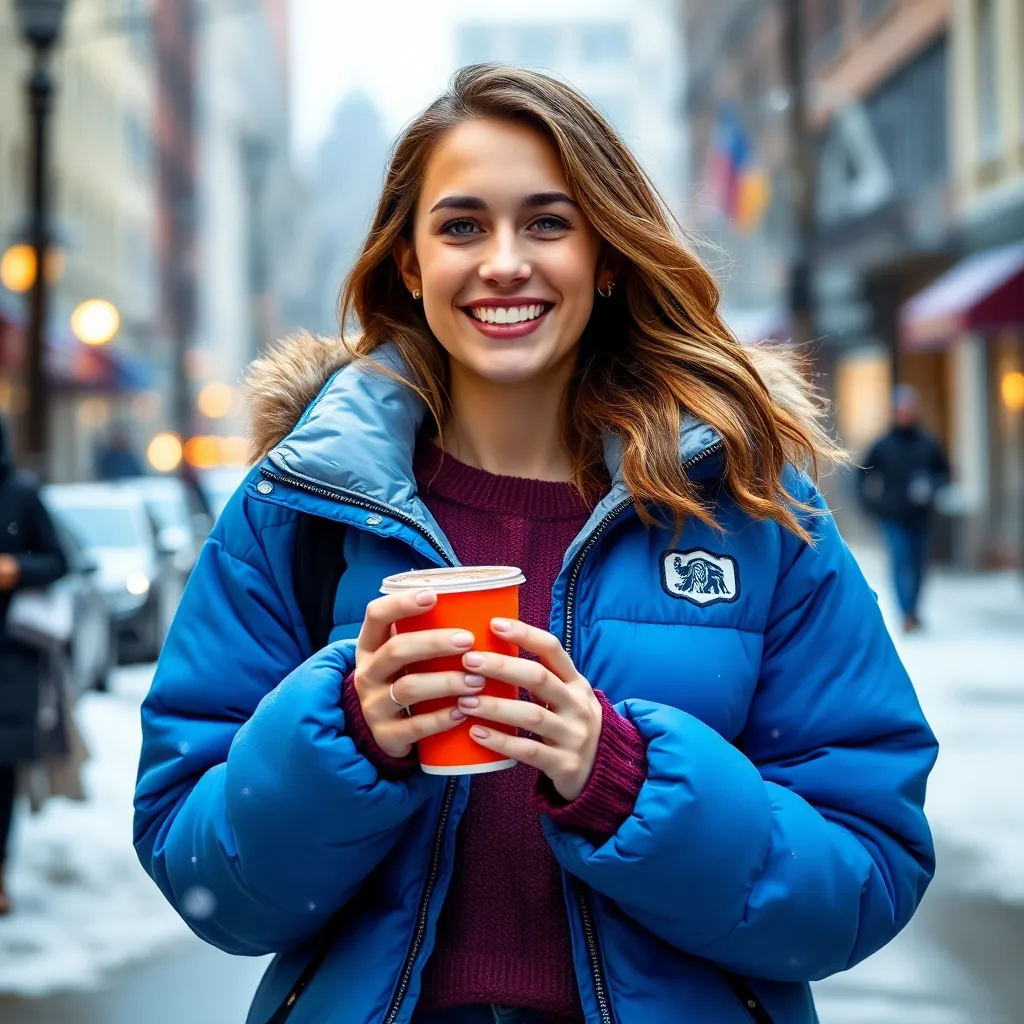 Imagine a trendy puffer jacket worn by a young woman on a crisp winter morning. The jacket is a bold shade of bright blue, with a fluffy white trim and a sleek black zipper. She's walking down a snowy street, surrounded by towering skyscrapers and bustling city life. Create an image that captures her stylish and adventurous vibe.