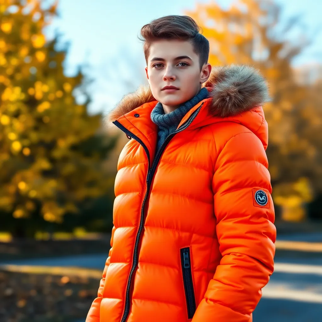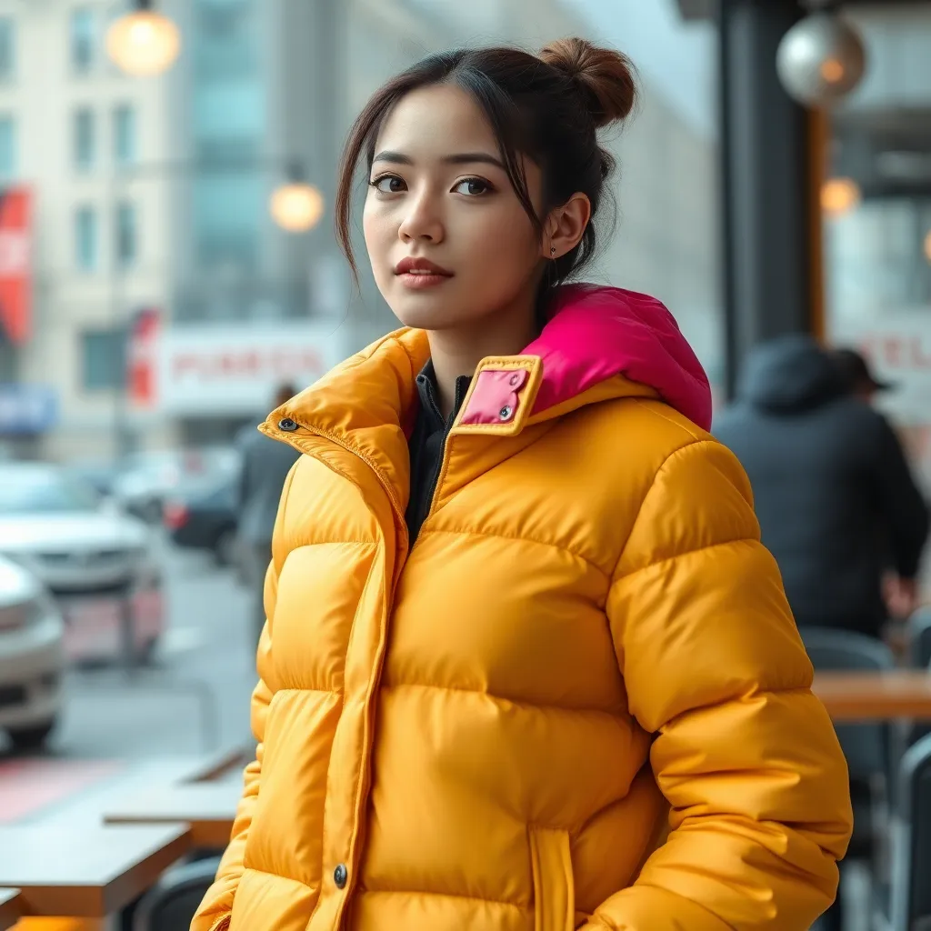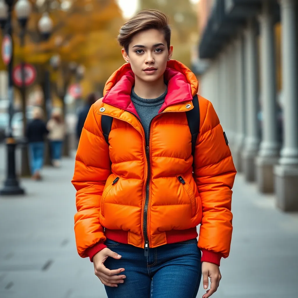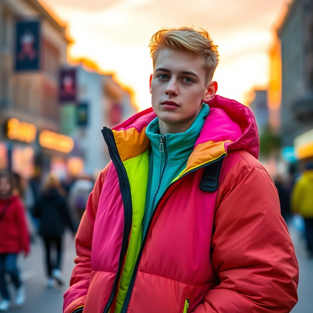 Create an image of a stylish and cozy puffer jacket, with a bold color palette and unique design elements. The jacket should be worn by a young adult with a casual, relaxed expression, against a winter cityscape or snowy background. Incorporate subtle textures and highlights to bring the image to life.