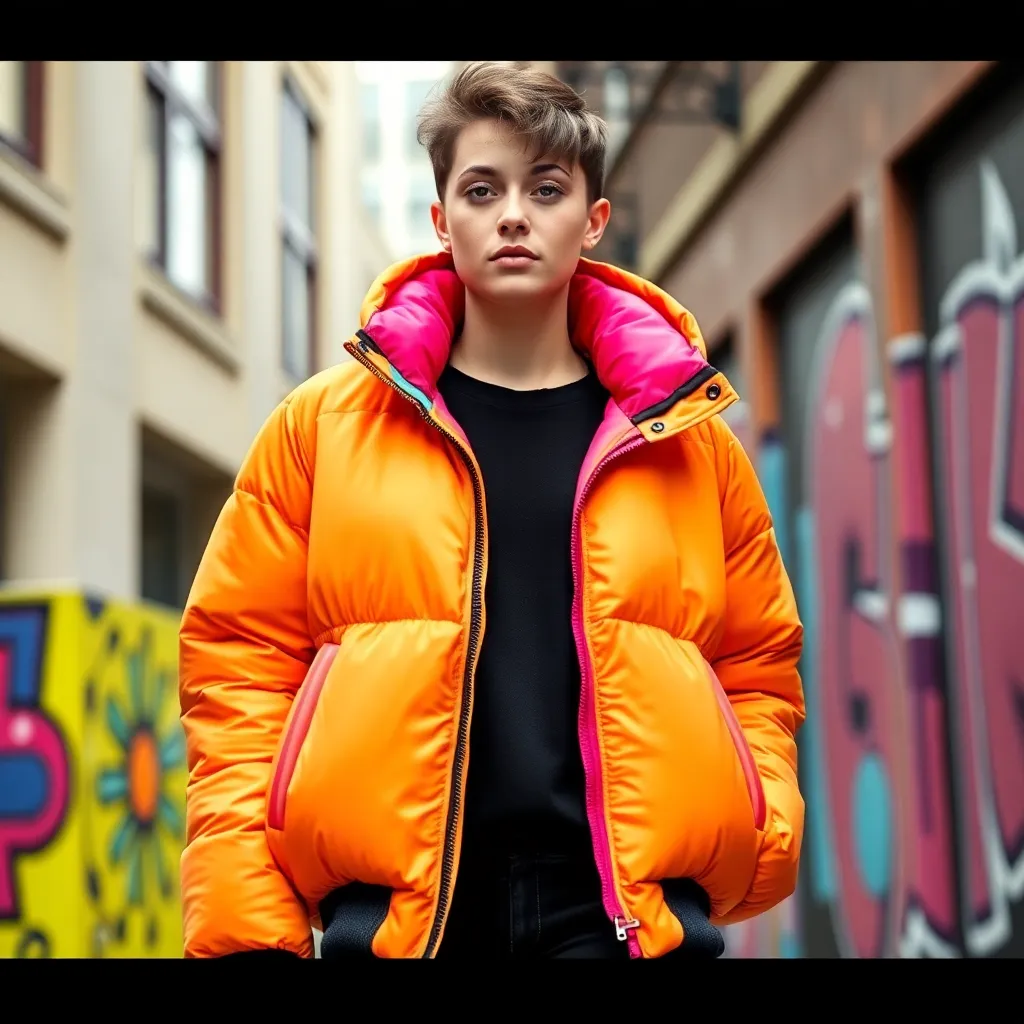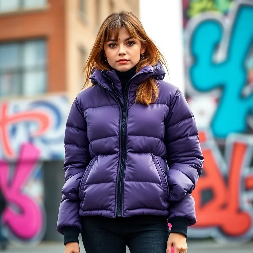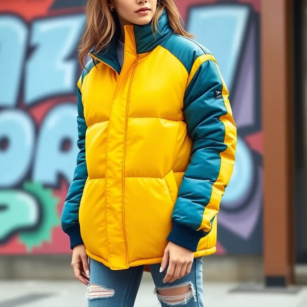 Create an image of a trendy puffer jacket with a bold color scheme. The jacket should have a fitted silhouette with a stand-up collar and adjustable cuffs. It should be worn by a young adult with a stylish outfit, perhaps with a pair of distressed denim jeans and sneakers. Incorporate a cityscape or street art in the background.