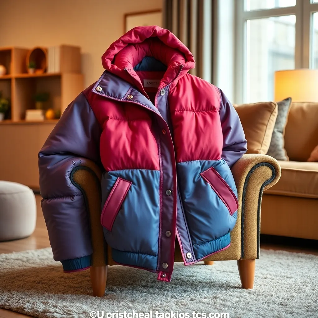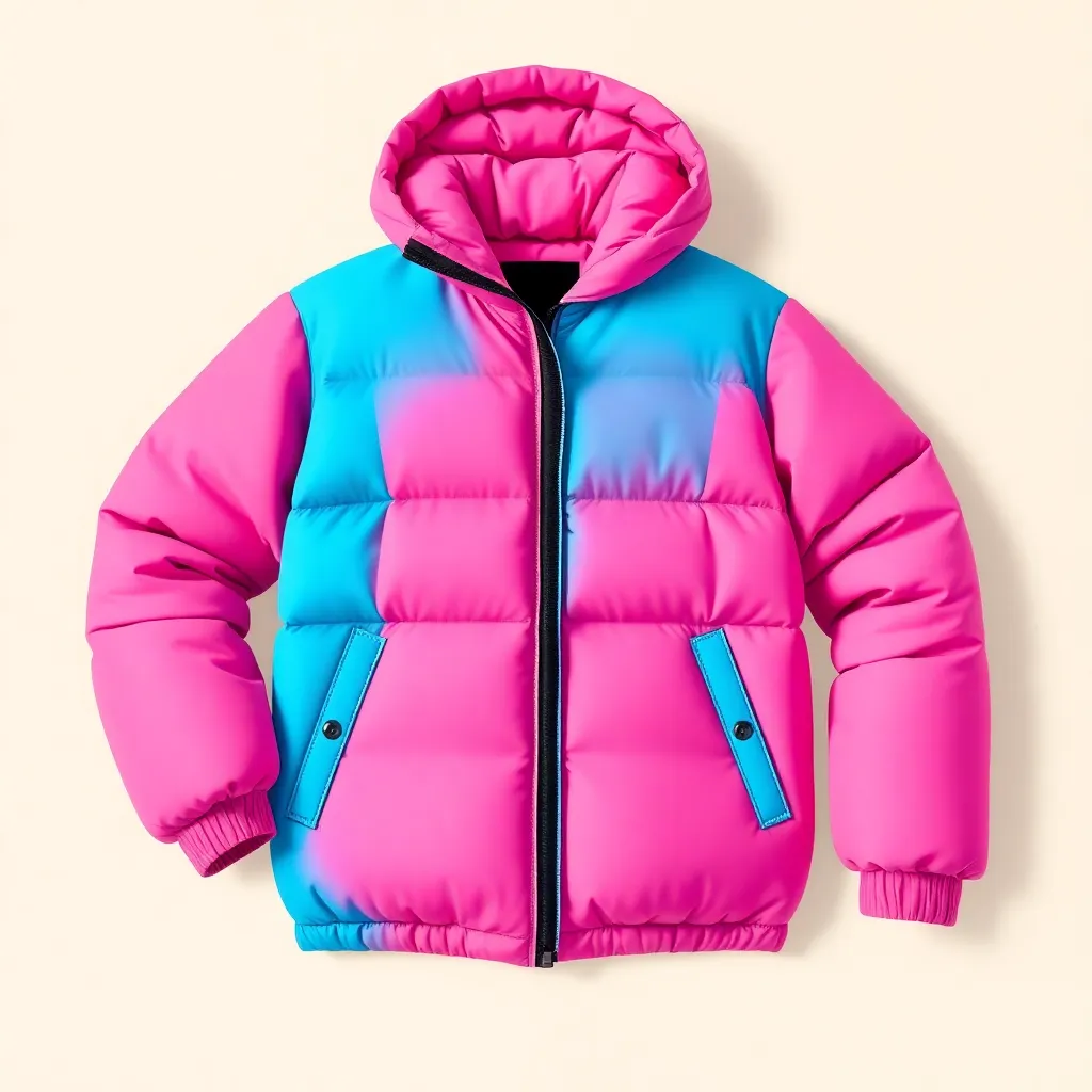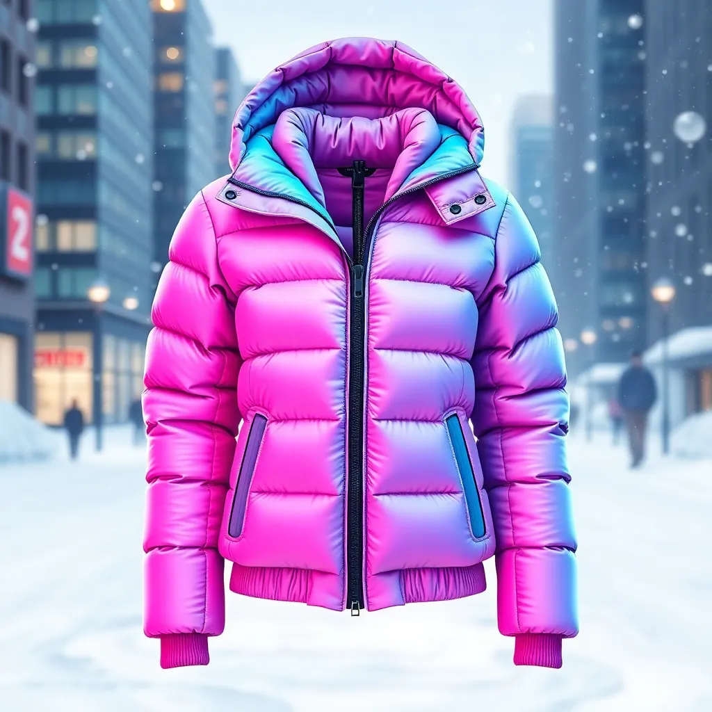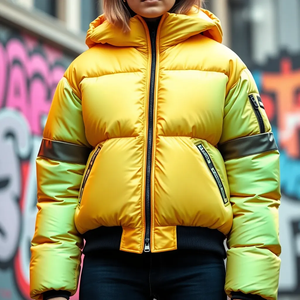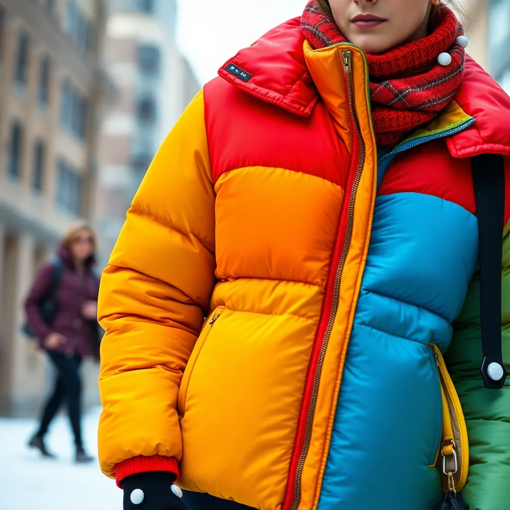 Design a stylish puffer jacket for a trendy winter outfit. The jacket should have a bold, bright color scheme with a mix of bold stripes and subtle textures. Incorporate a hood and adjustable cuffs for added functionality. The overall look should be modern, chic, and perfect for a night out in the city.