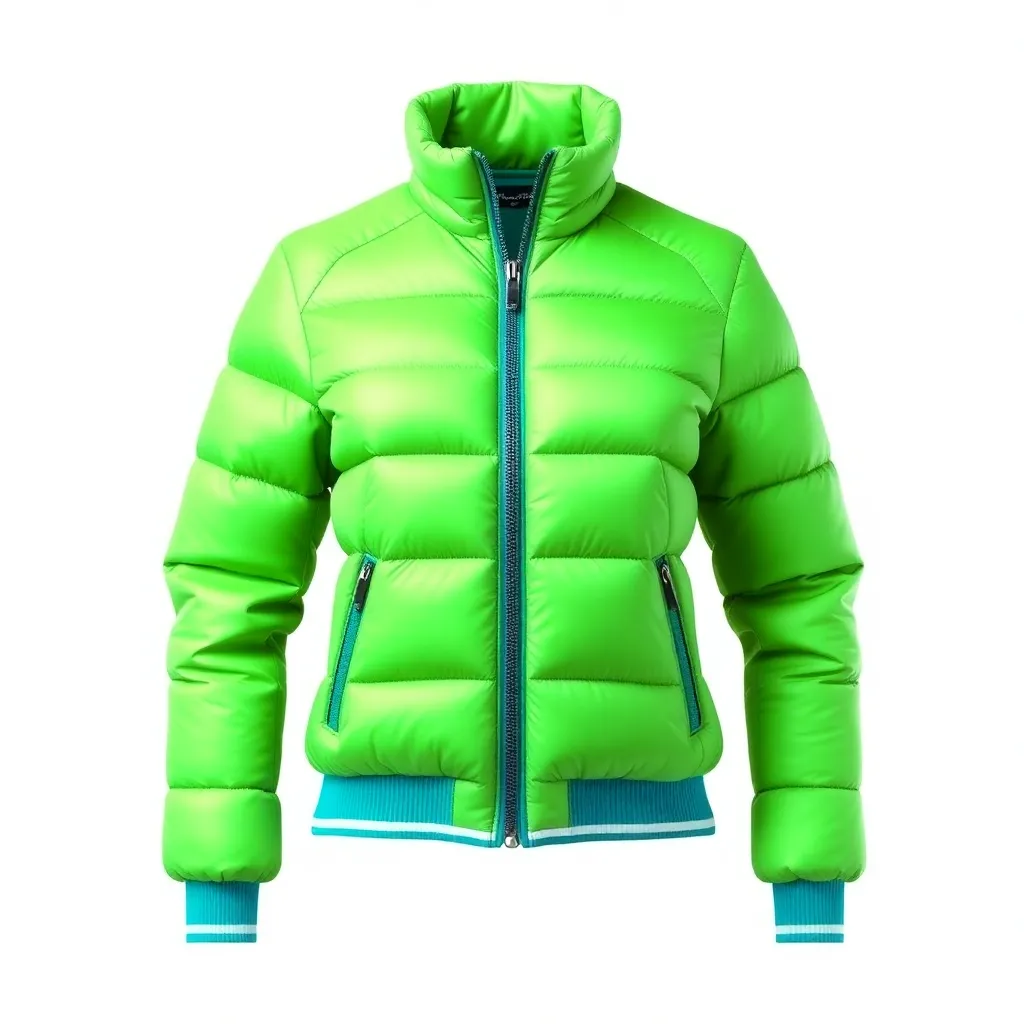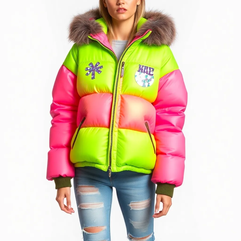 Imagine a trendy puffer jacket in a bold, neon green color, adorned with iridescent sequins and a fuzzy trim. The jacket is styled with a casual, oversized fit, paired with distressed denim jeans and white sneakers. Capture the jacket's vibrant colors and textured details in a striking, high-fashion image.