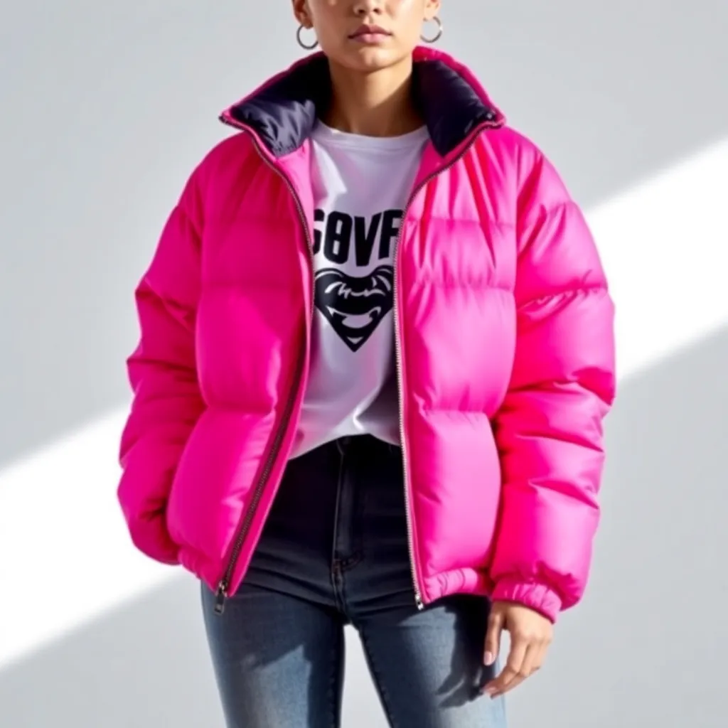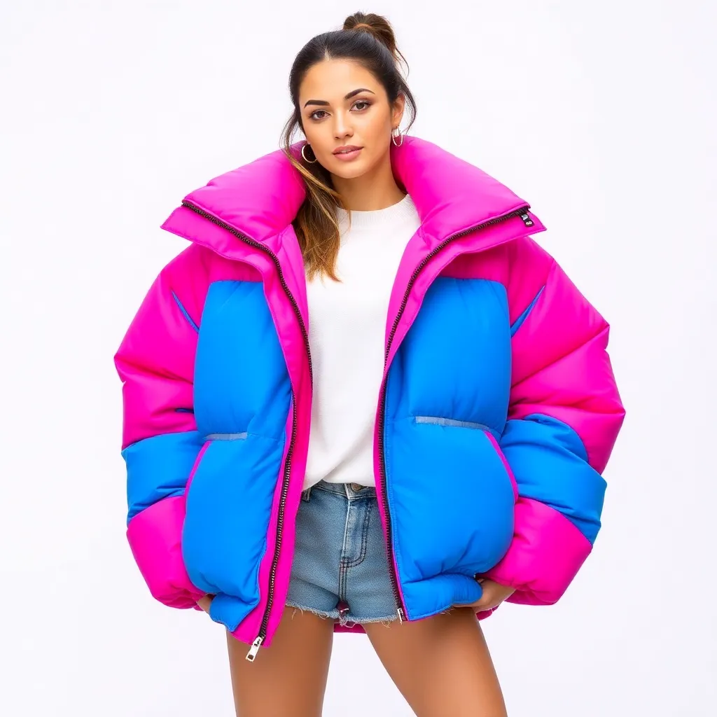 Create an image of a trendy, oversized puffer jacket in a bold, bright color (such as neon pink or electric blue). The jacket should have a chunky, textured design with a stand-up collar and a zip-up front. The model should be wearing the jacket over a casual outfit, with a relaxed pose and a confident expression.