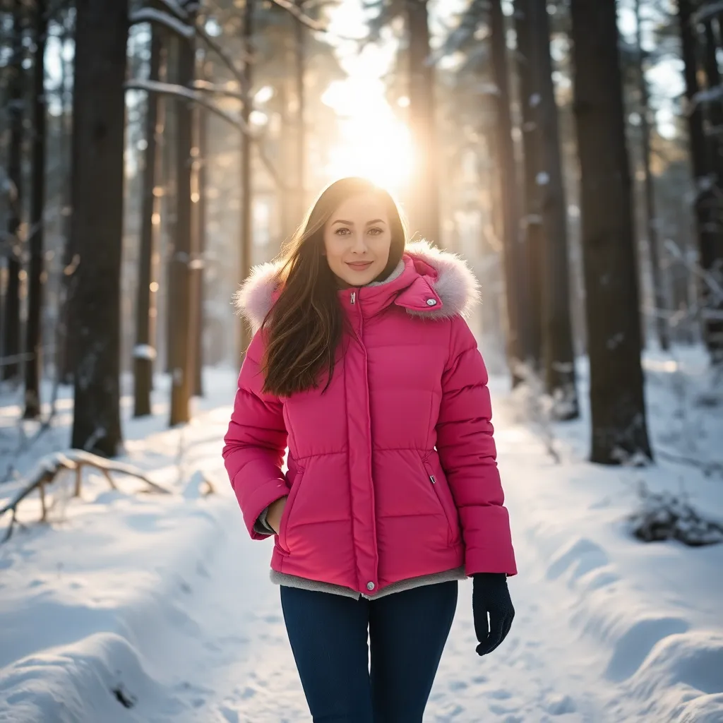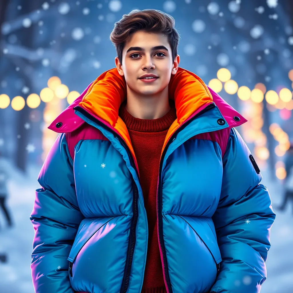 Create a stylized image of a trendy puffer jacket with a bold color palette and unique design elements. The jacket should be worn by a young adult in a winter wonderland setting, surrounded by snowflakes and twinkling lights. Incorporate a fun and playful atmosphere, with a hint of luxury and sophistication.