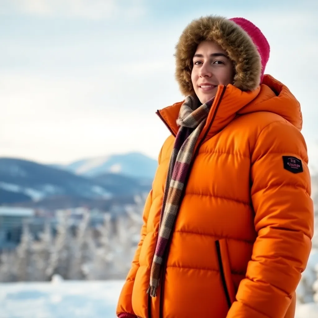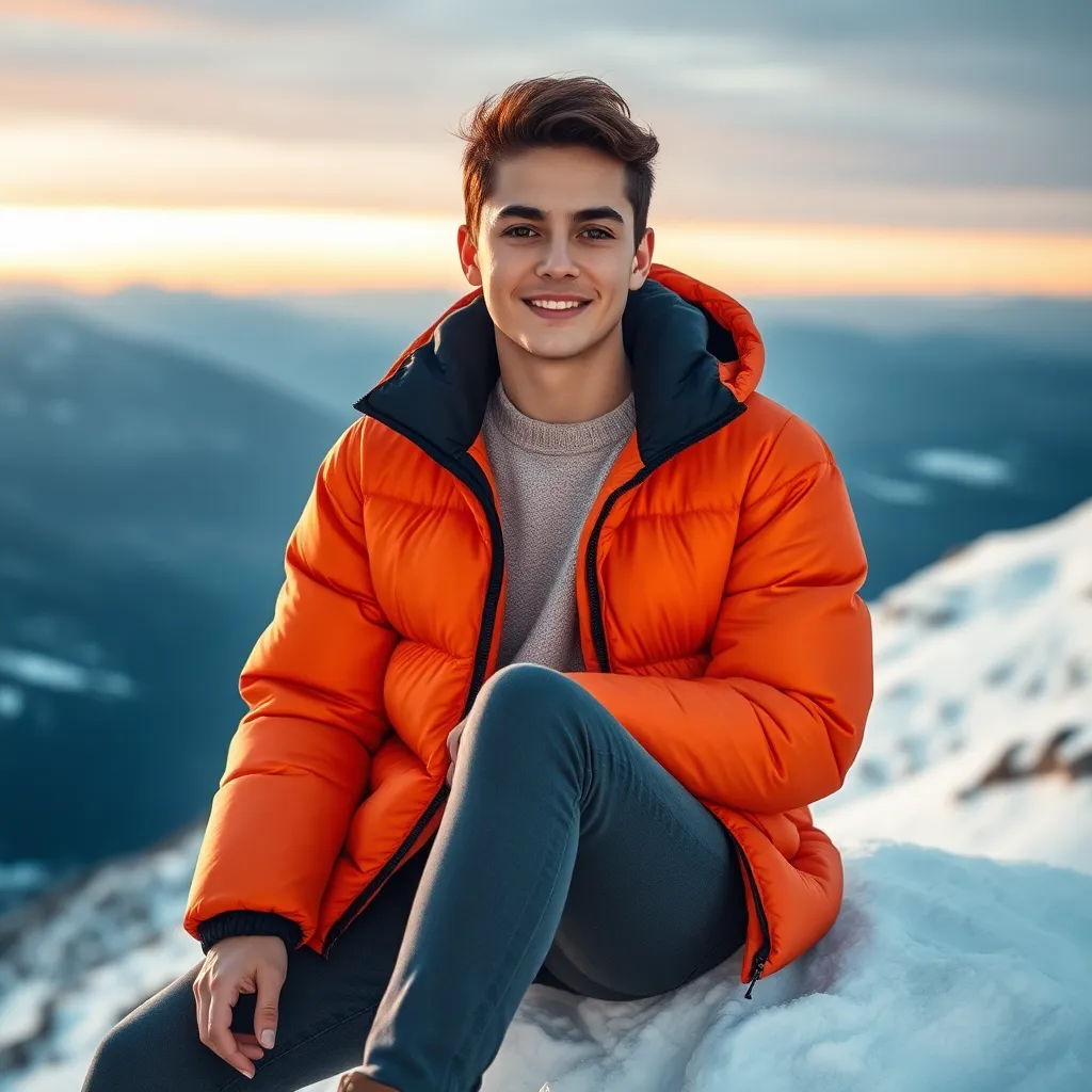 Create a warm and stylish image of a puffer jacket. The jacket should be a vibrant orange color with a subtle texture. It should be worn by a young adult with a relaxed expression, sitting on a snowy mountain peak with a scenic view in the background. Incorporate a subtle glow effect to capture the cozy atmosphere.