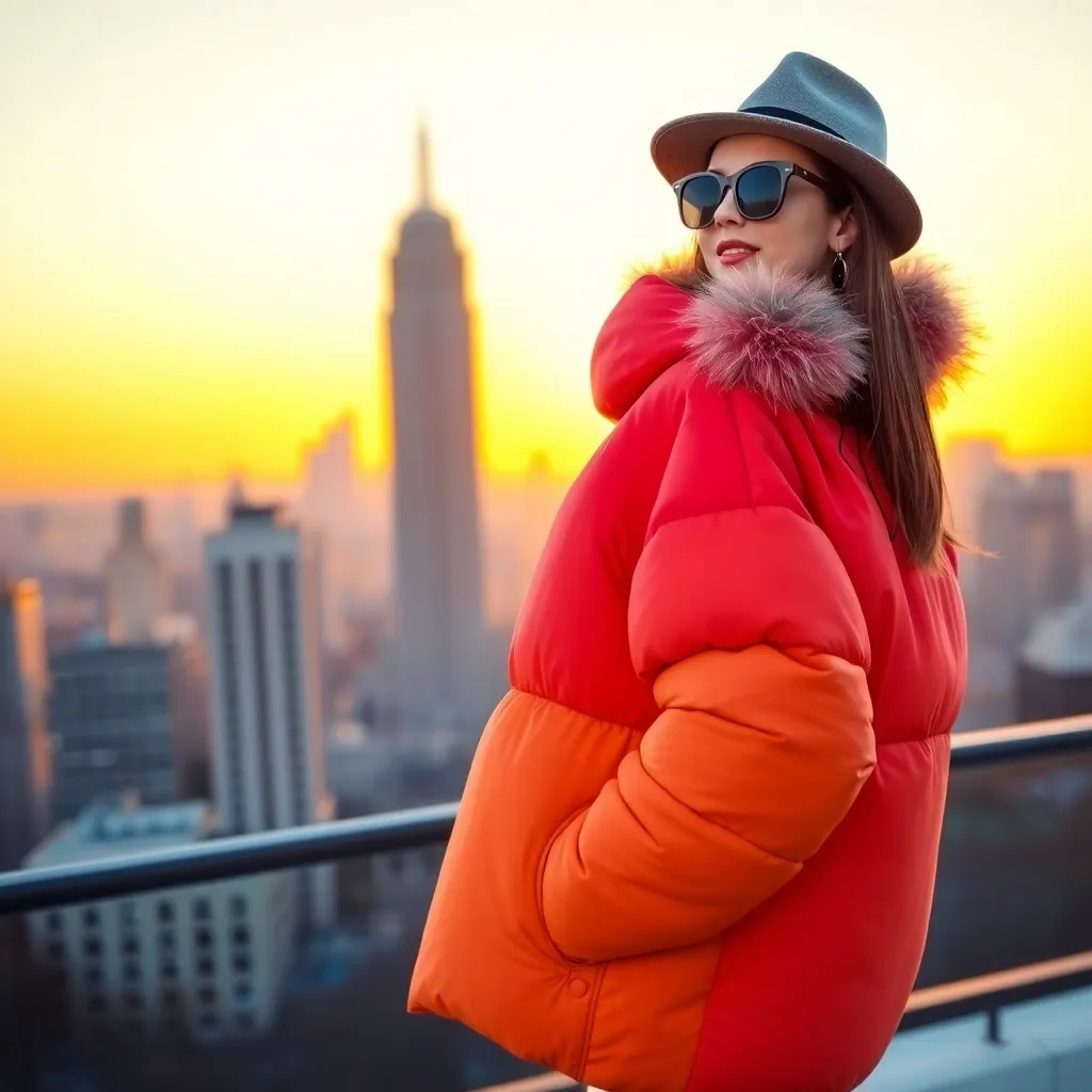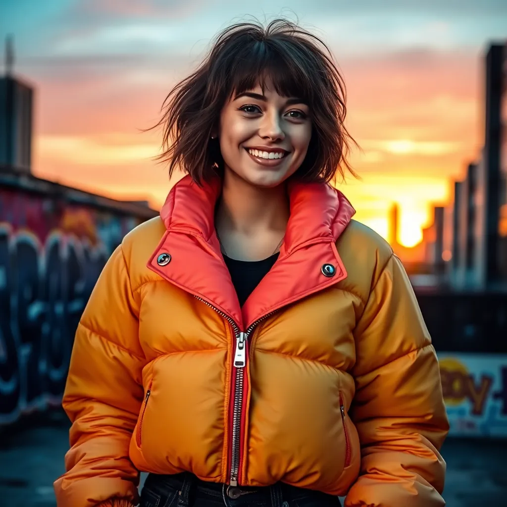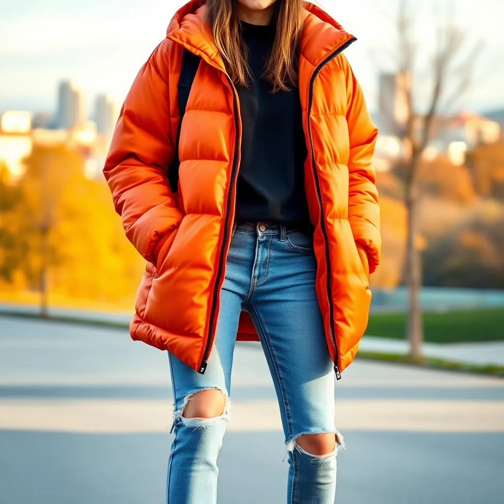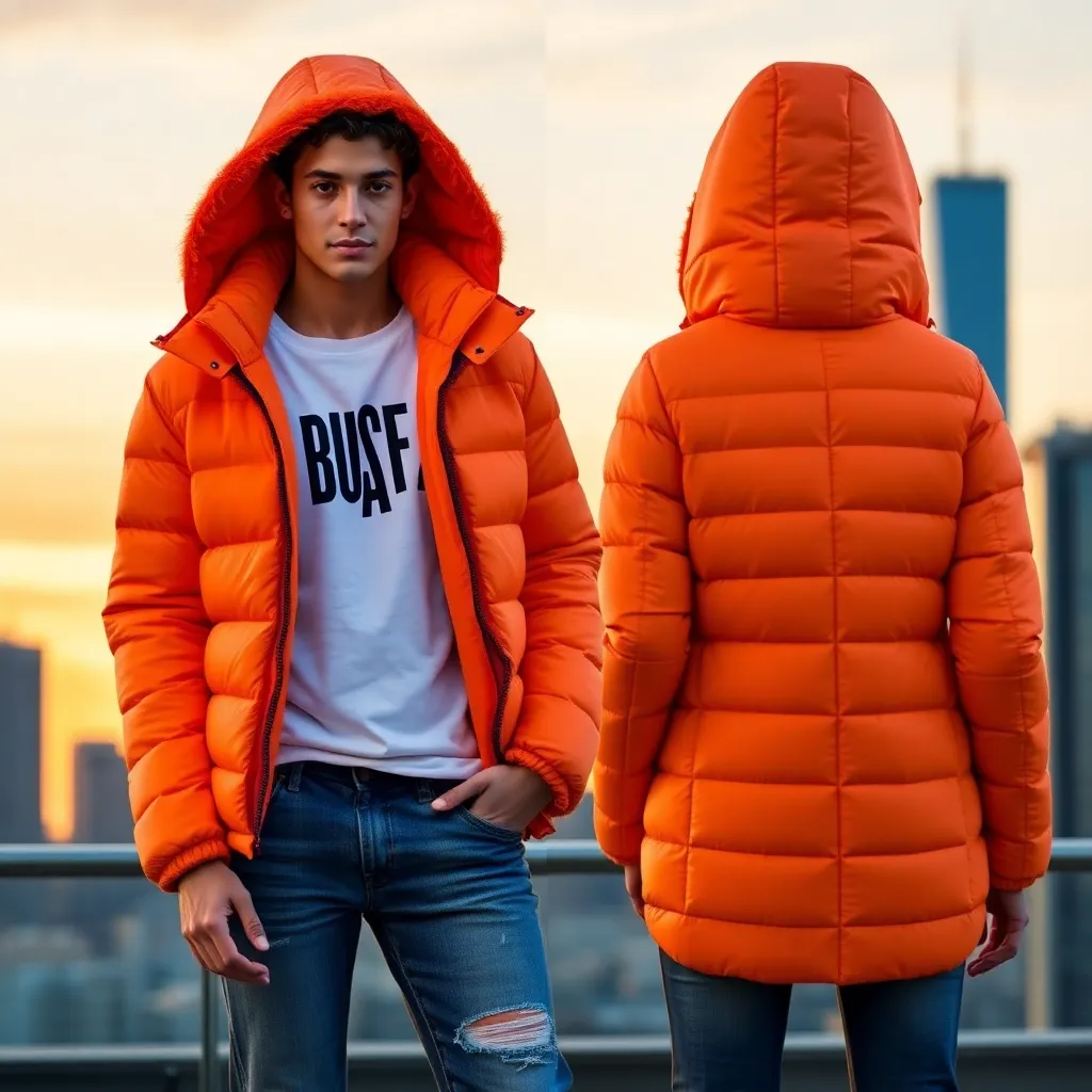 Create an image of a trendy, bright orange puffer jacket with a fitted silhouette and oversized hood. The jacket should have a textured, fuzzy exterior and a smooth, glossy interior. The model should be wearing the jacket with a white graphic t-shirt and distressed denim jeans, standing in front of a cityscape at sunset.