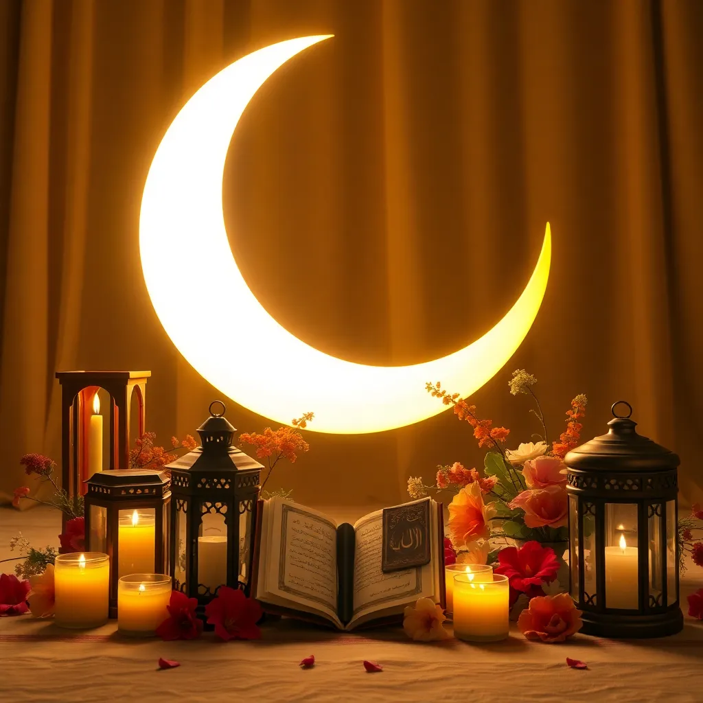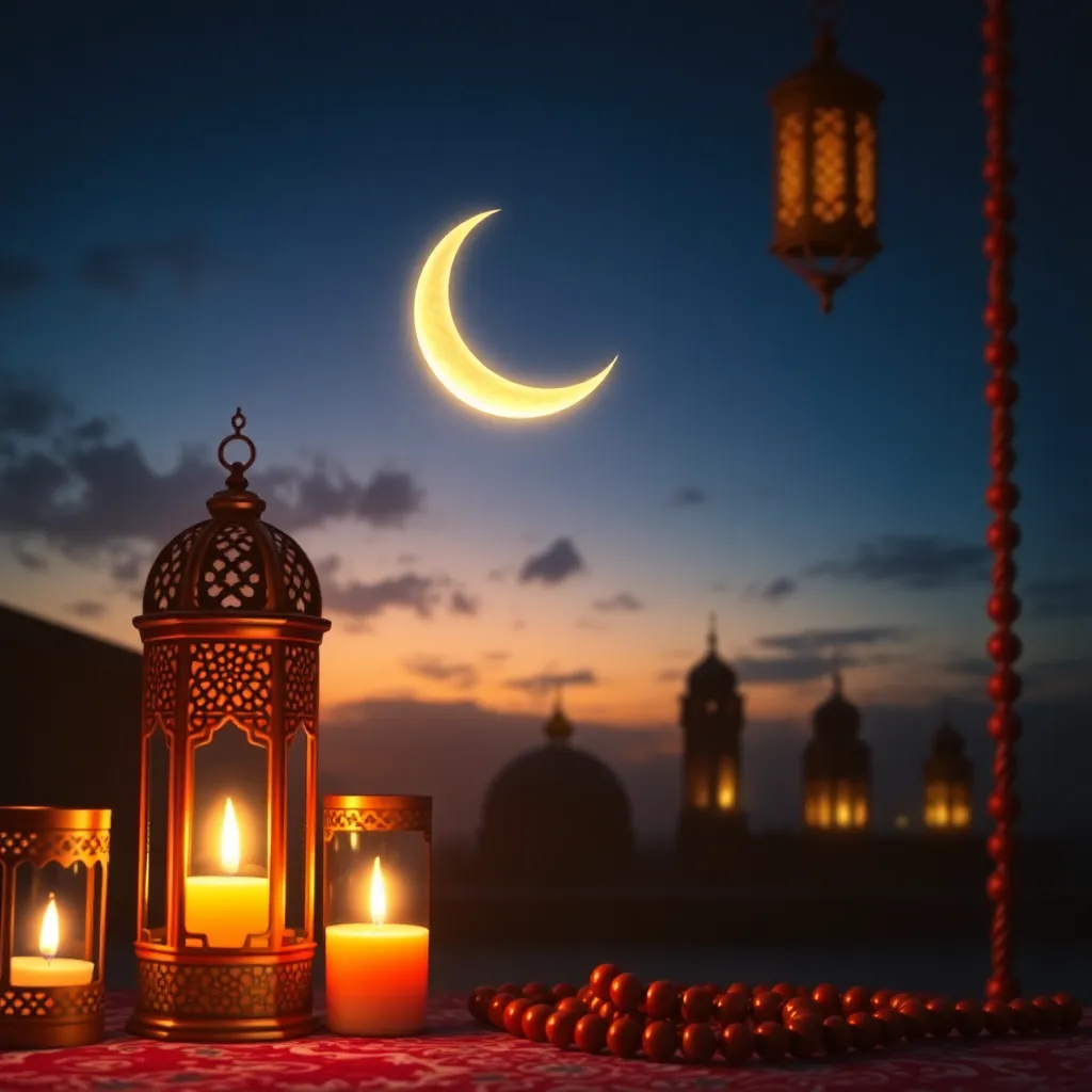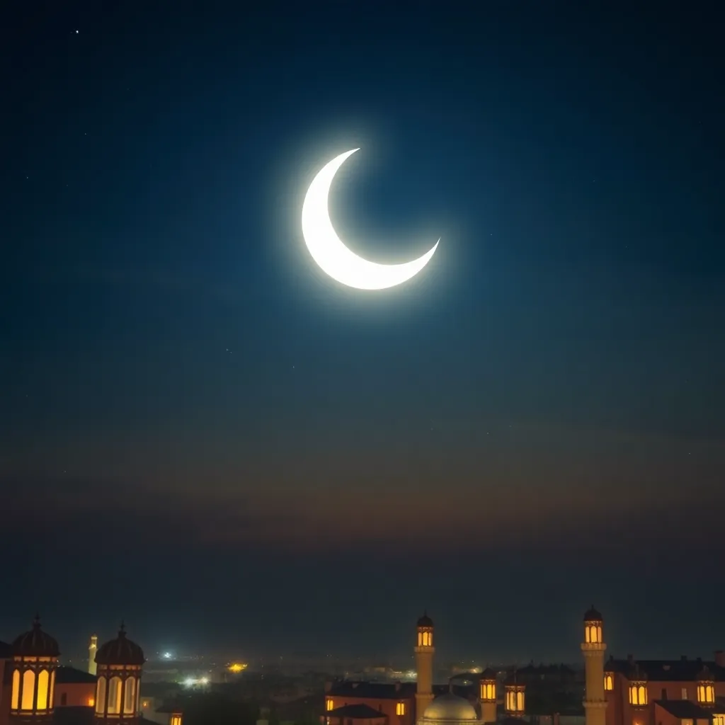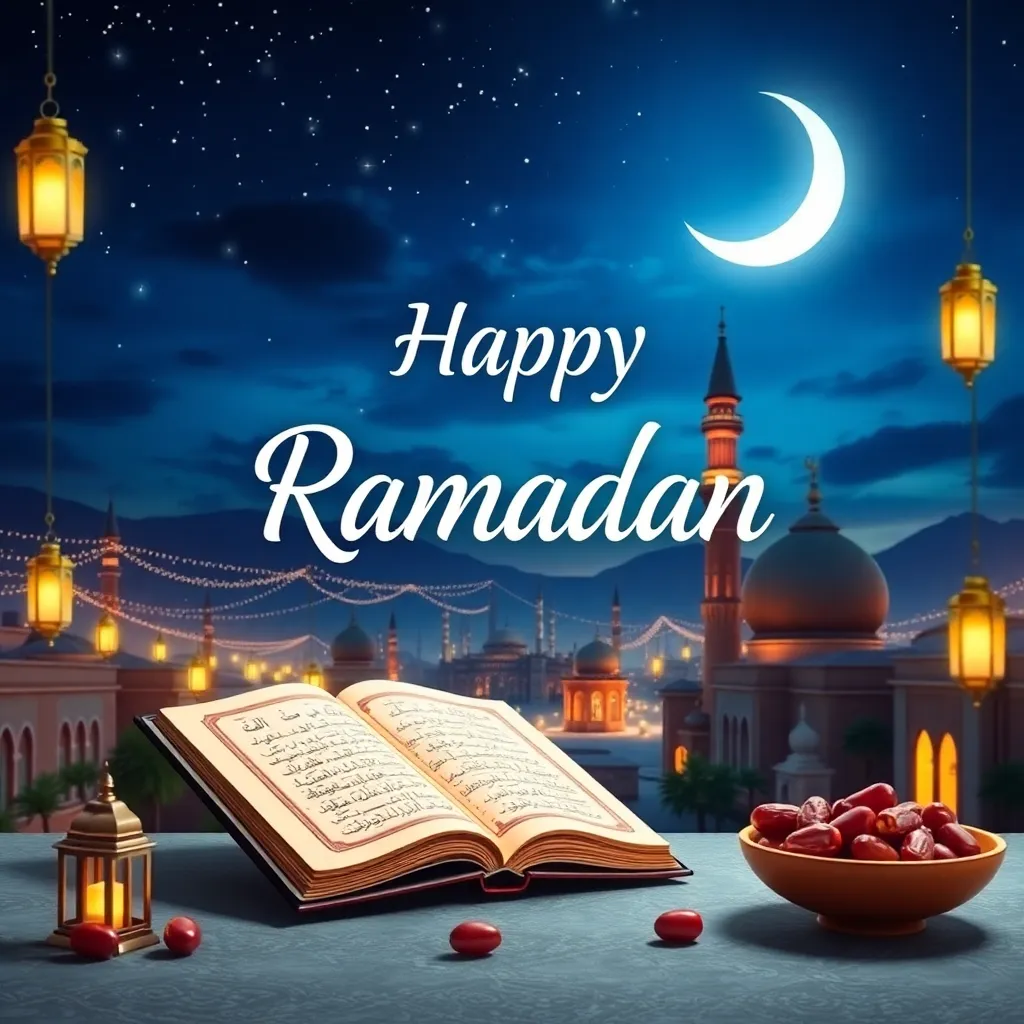Capture the essence of Ramadan with a vibrant image that reflects the beauty of the holy month. Depict a serene night sky with a crescent moon, surrounded by a cityscape adorned with twinkling lights, lanterns, and traditional Arabic architecture. Incorporate symbols of fasting, prayer, and community, such as a Quran and a bowl of dates.