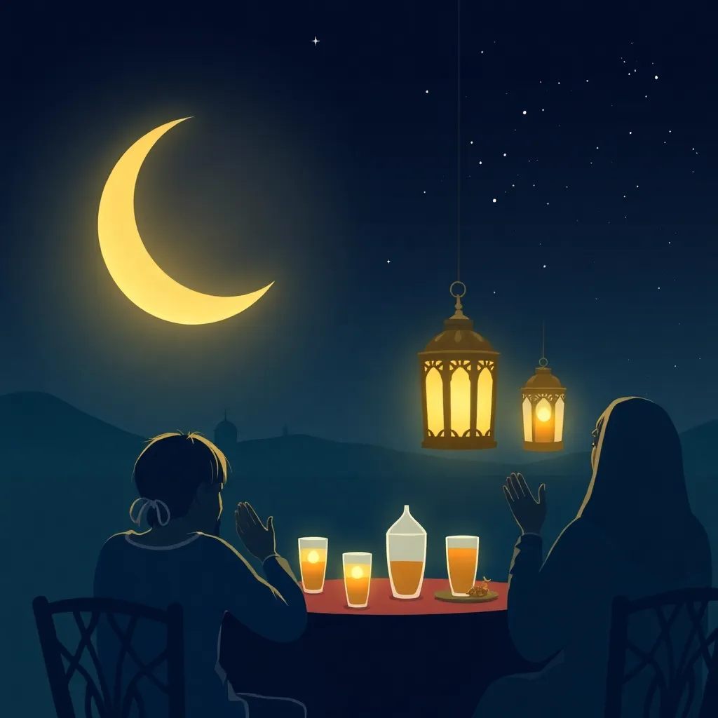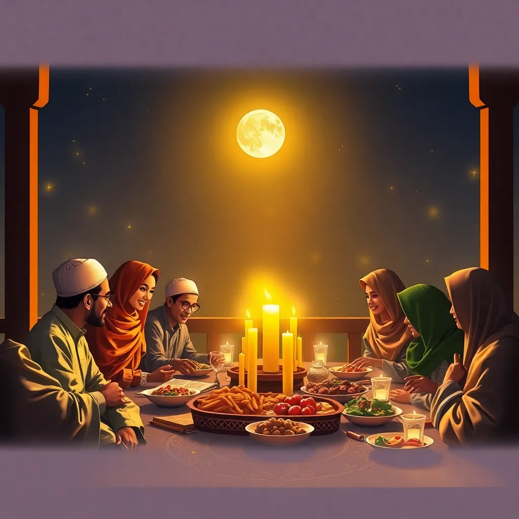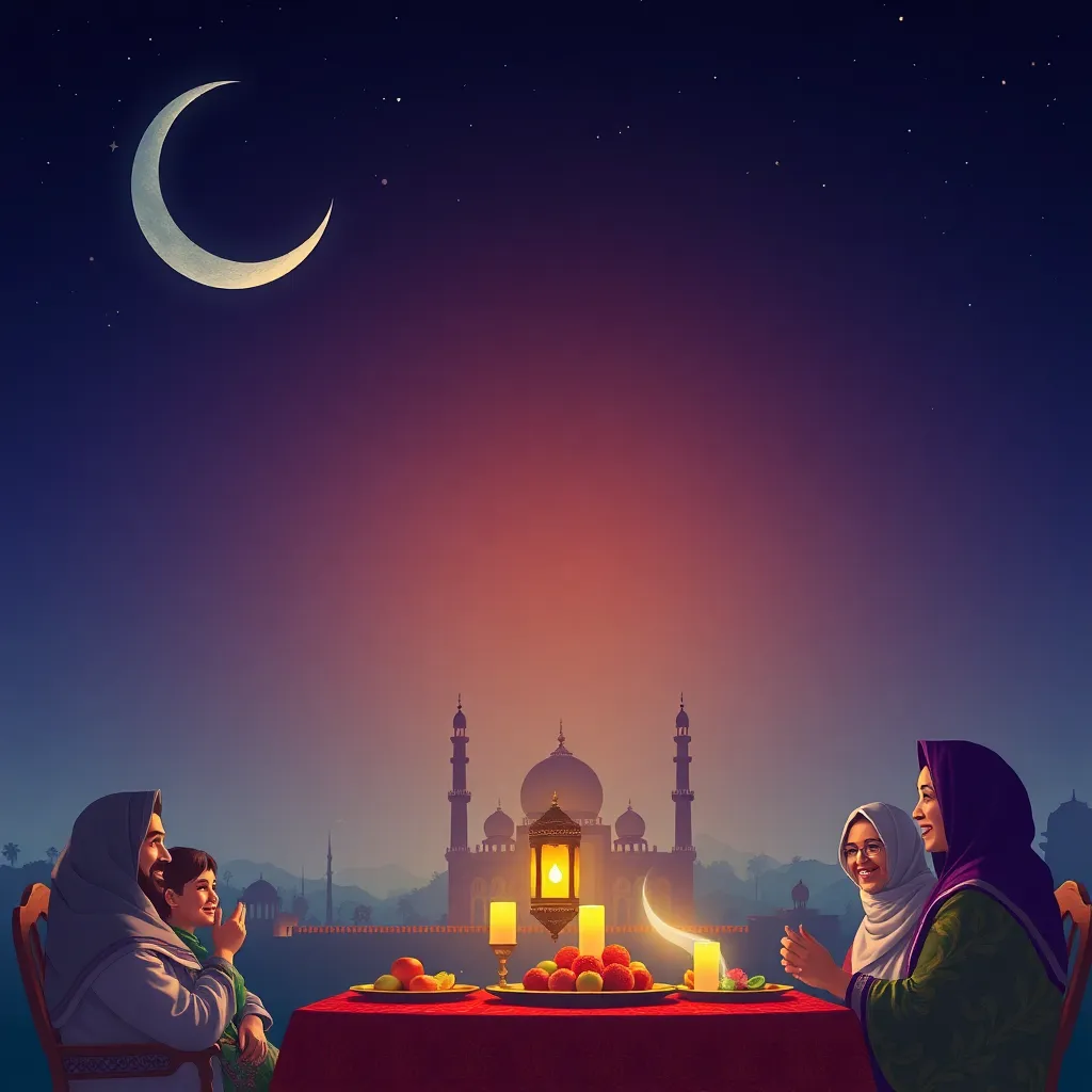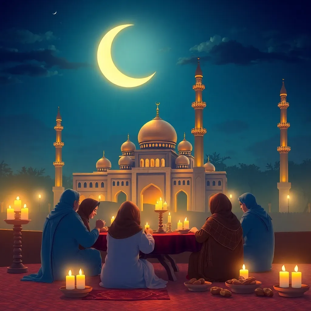 Create an image that captures the essence of Ramadan, a time of spiritual reflection and growth. Depict a serene nighttime scene with a crescent moon, a mosque's minaret, and a family gathered around a table, breaking their fast with dates and water. Incorporate warm colors and soft lighting to evoke a sense of peace and tranquility.