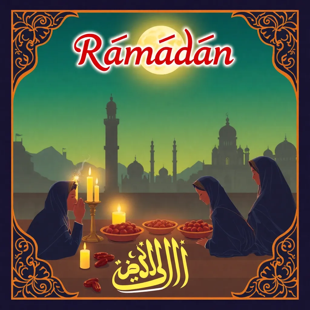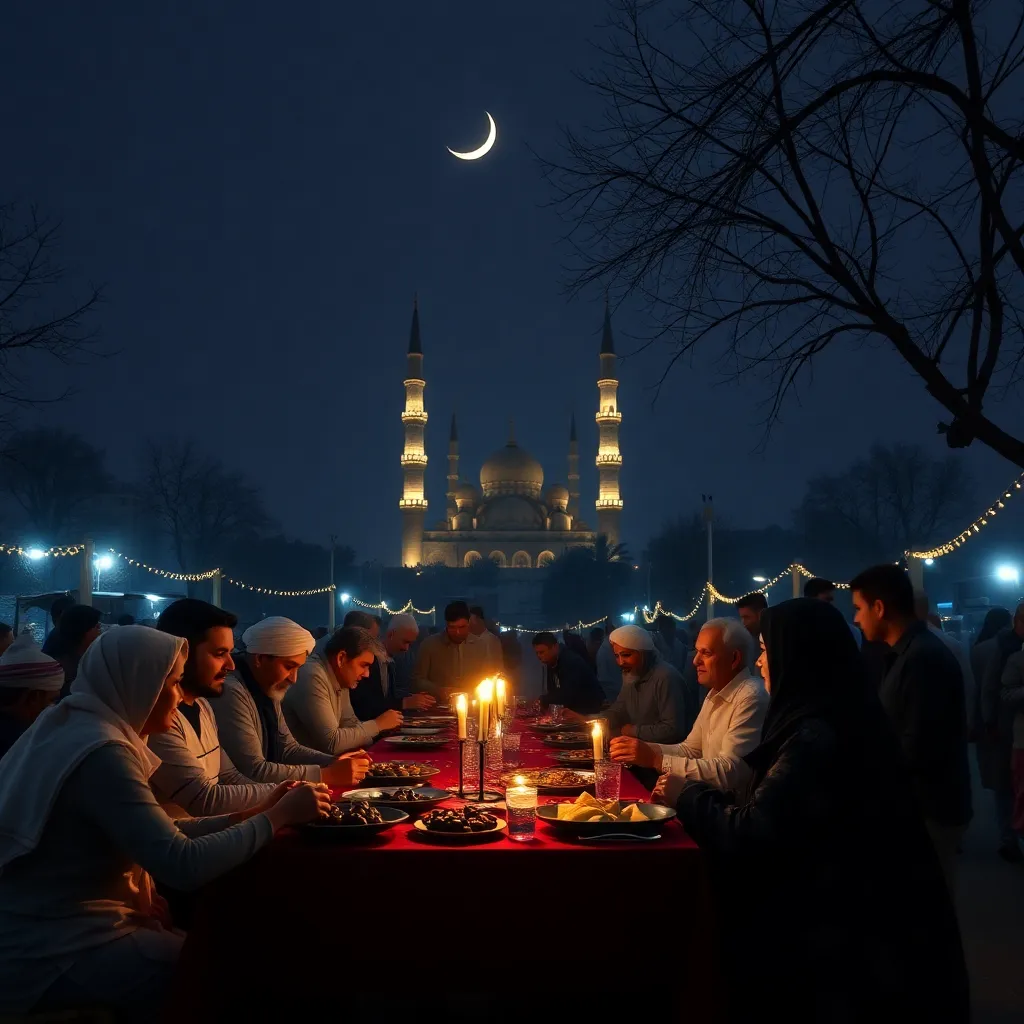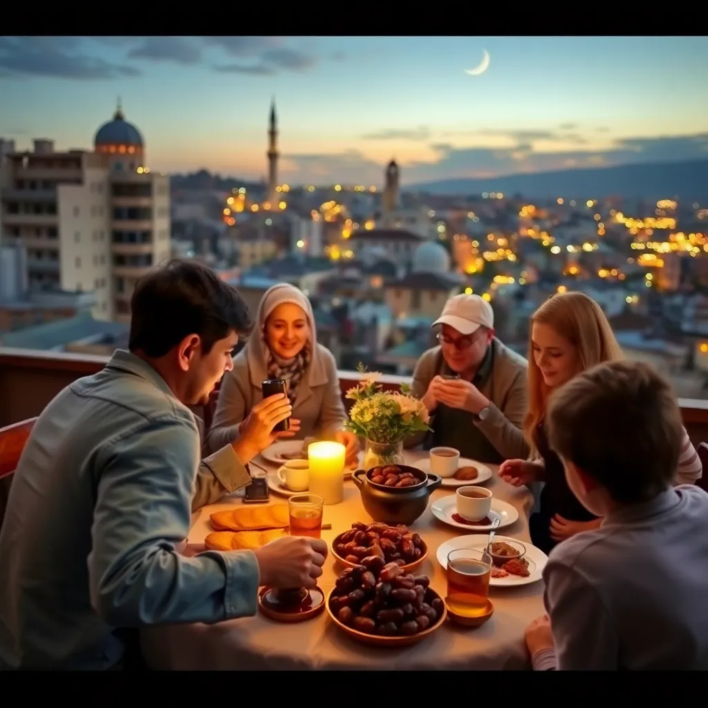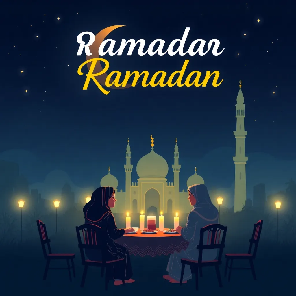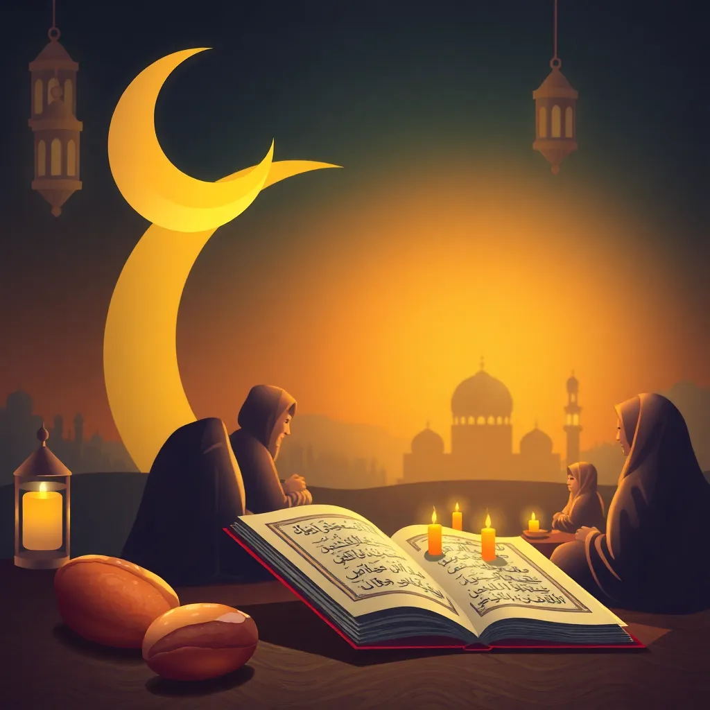 Create an image that captures the essence of Ramadan, a time of spiritual reflection and growth. Depict a serene nighttime scene with a crescent moon, a mosque's minaret, and a family gathered around a table, breaking their fast with dates and water. Incorporate warm colors and soft lighting to evoke a sense of peace and tranquility.