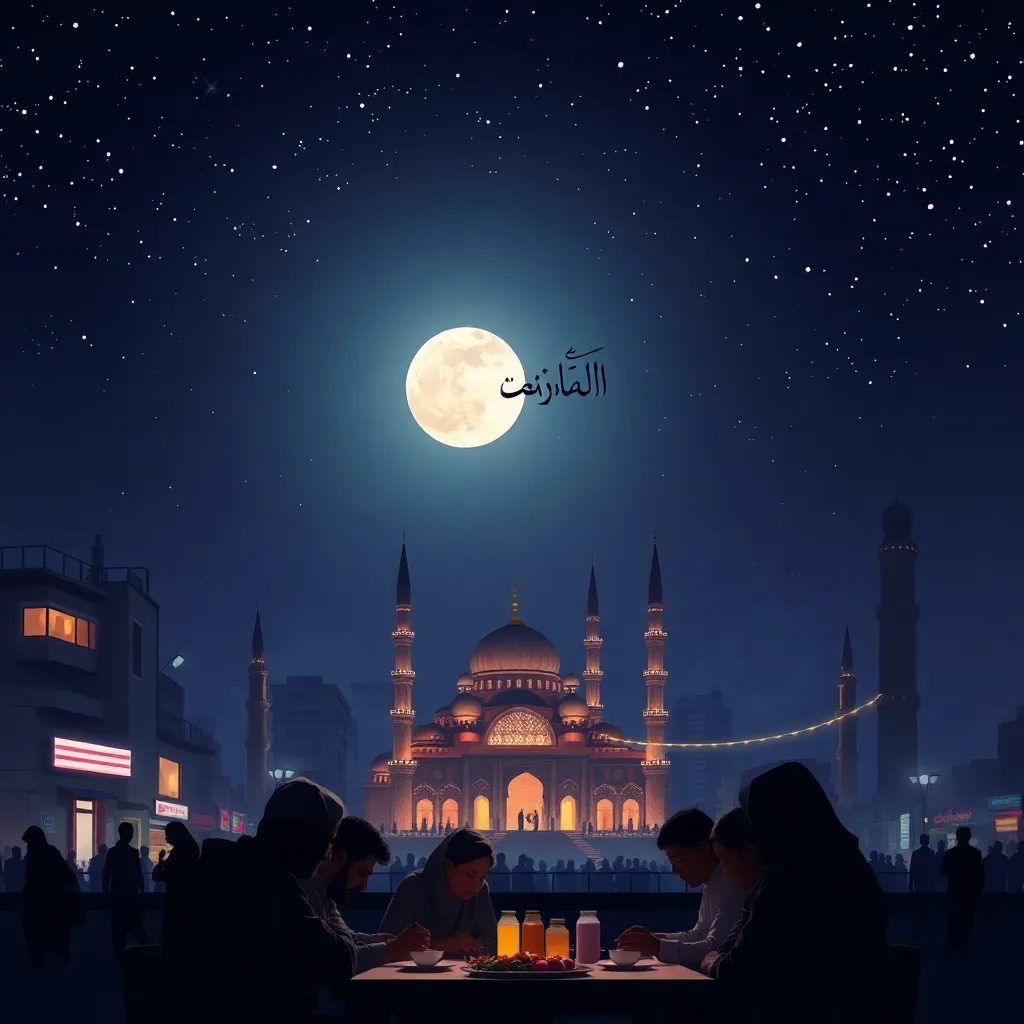 Create an image of a serene and peaceful night scene in a bustling city during Ramadan. The sky is filled with twinkling stars, and the moon is full and bright. A mosque in the distance is illuminated, with the words 'Ramadan Kareem' written in Arabic calligraphy. People are gathered around a table, sharing a meal together.