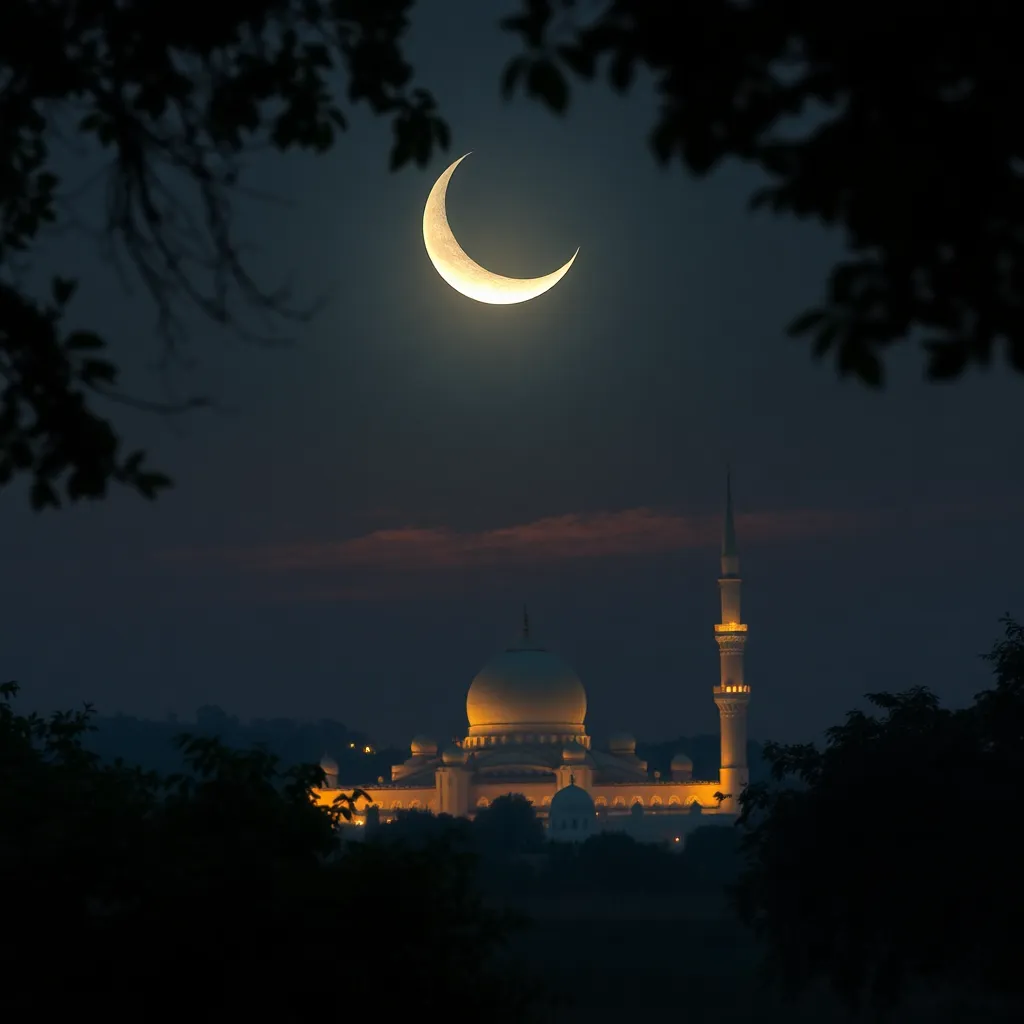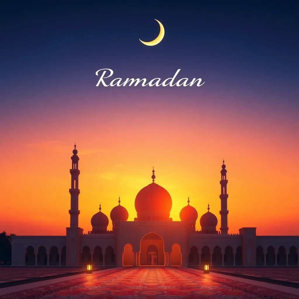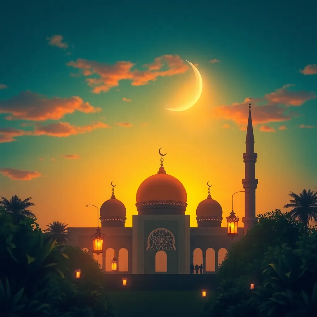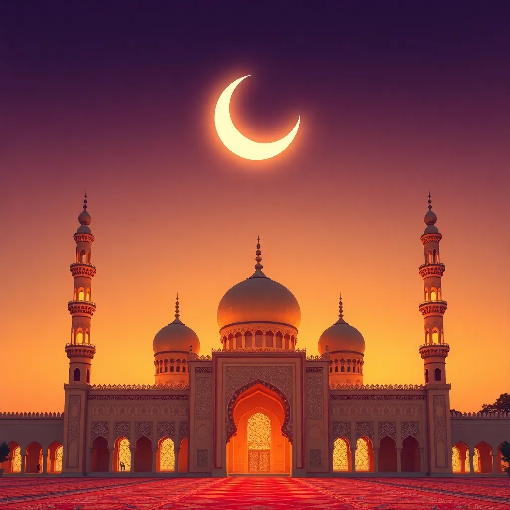 Create an image that captures the essence of Ramadan, a time of spiritual reflection and community. Depict a serene mosque at sunset, with the crescent moon shining bright in the sky. Incorporate vibrant colors and intricate patterns to reflect the beauty of Islamic art and architecture. Convey a sense of peace and tranquility.