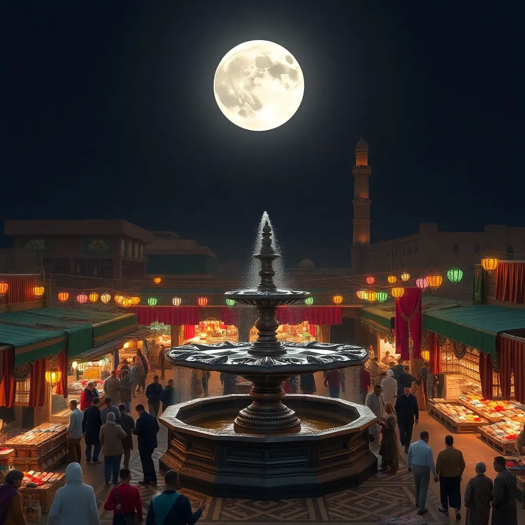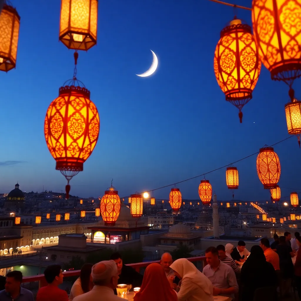 As the crescent moon rises, a vibrant cityscape transforms into a haven of spirituality. Lanterns adorned with intricate patterns and Arabic calligraphy illuminate the night sky. The scent of fresh dates and sweet pastries wafts through the air, as families gather together to break their fast under the stars.