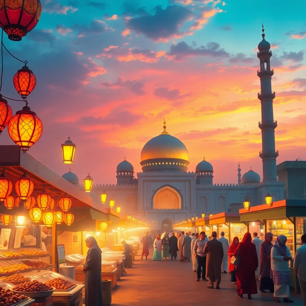 Create a serene and vibrant AI image of a bustling Ramadan market at sunset. The scene should feature colorful lanterns, fragrant food stalls, and joyful worshippers gathered around a majestic mosque. Incorporate soft, warm lighting and intricate Arabic calligraphy to capture the essence of this sacred month.