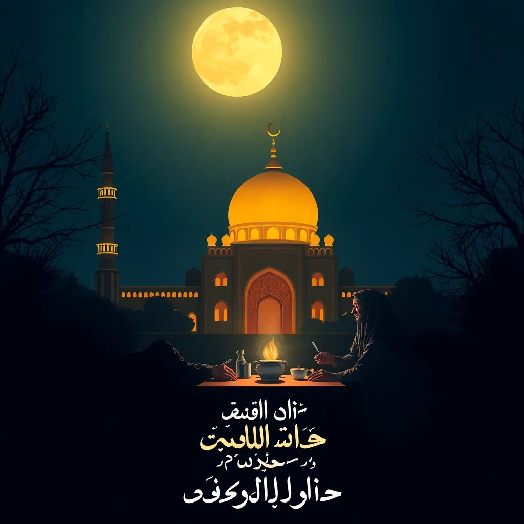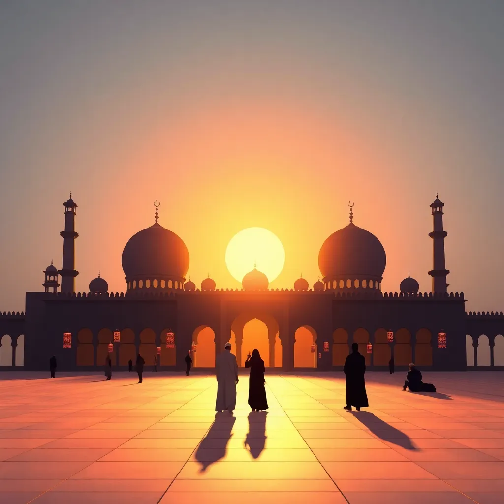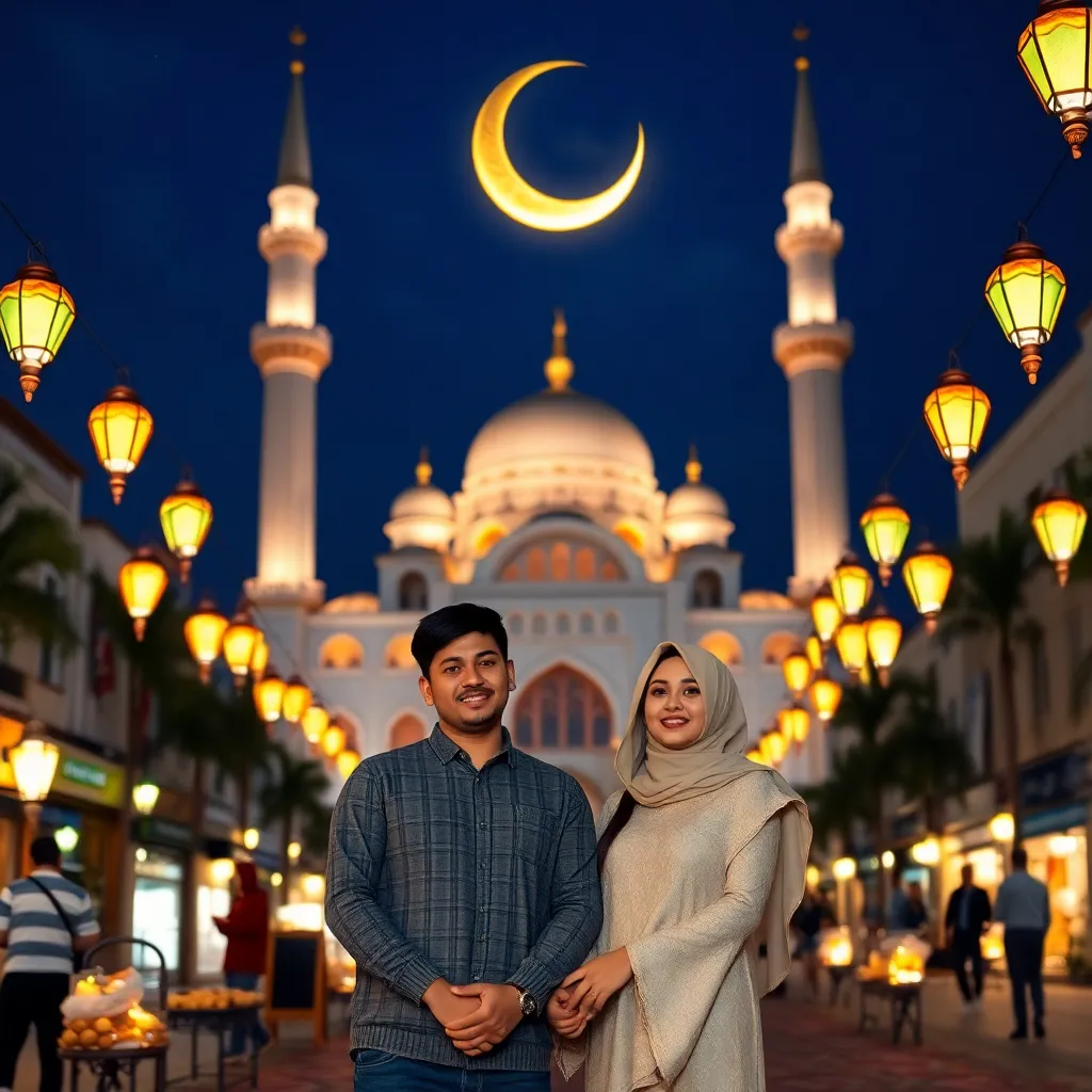 As the crescent moon rises, the city comes alive with the warmth of Ramadan. Vibrant lanterns illuminate the streets, while the sweet aroma of traditional desserts wafts through the air. A young couple, hands clasped, stands before a stunning mosque, their faces aglow with joy and devotion to the holy month.